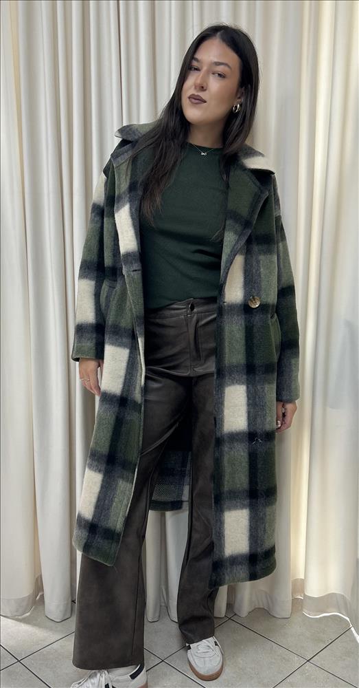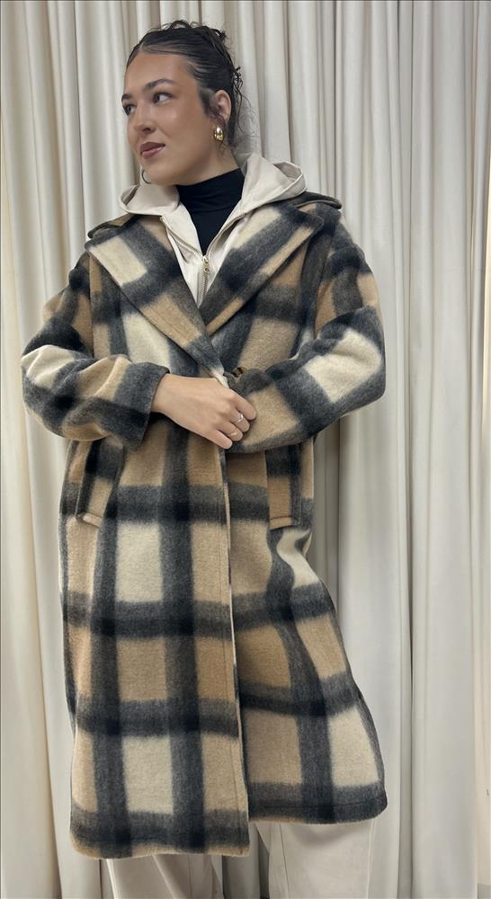 Dlhý károvaný kabát, z vnútornej strany podšitý. Na oboch stranách ma vrecká a gombíky na zapínanie.