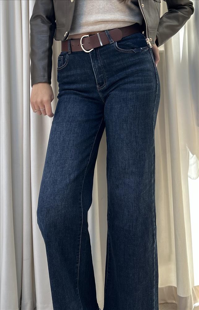 rifle s tmavým denimom, majú rozšírený spodok, dve vrecká vpredu a dve vzadu, opasok je v cene