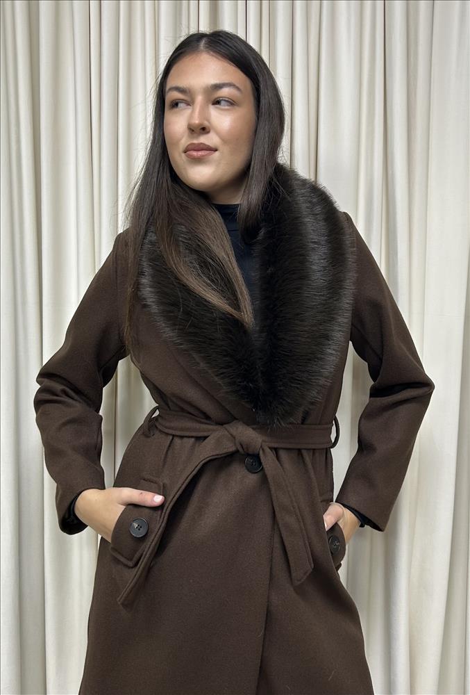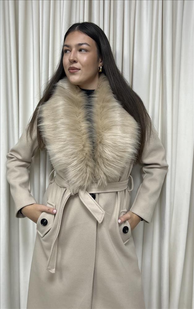 Dlhý, štýlový kabát s odnímateľným kožušinovým límcom, má jednoradové zapínanie, v páse si ho viete prispôsobiť s opaskom, vrecká má zdobené gombíkom. Kožušinový límec je krásny, výrazný a príjemne hebký na dotyk. Veľkosť je UNI, sedí od S-L.