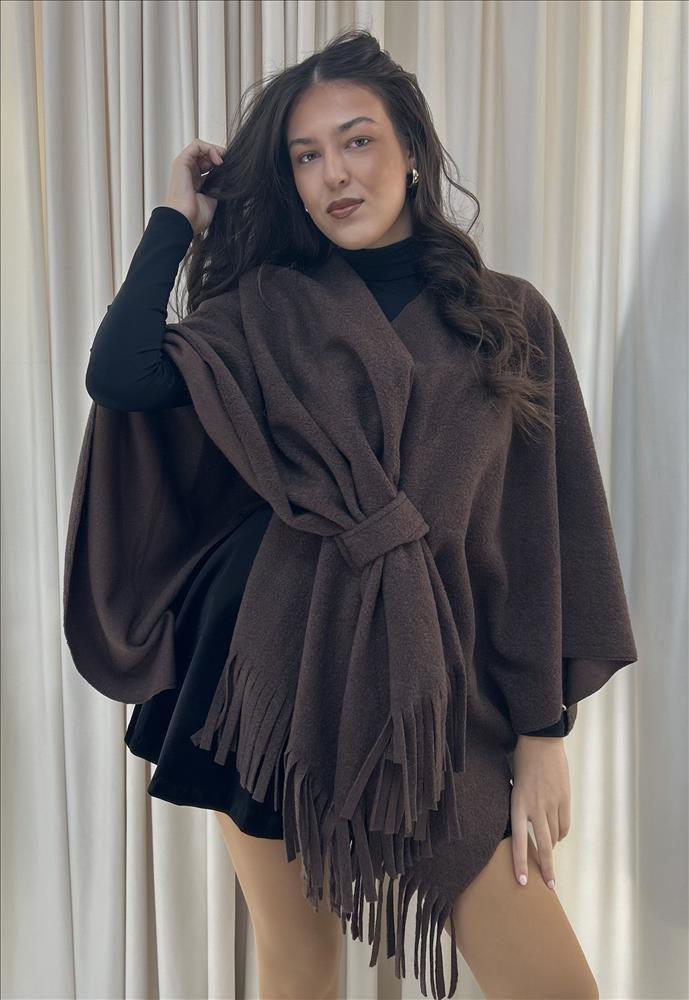 Toto štýlové pončo je dokonalým spojením elegancie a pohodlia. Vyrobené z mäkkého, hrejivého materiálu, krásne sadne na každý typ postavy. Voľný strih s viazaním v páse zvýrazní siluetu a dodá outfitu sofistikovaný vzhľad.