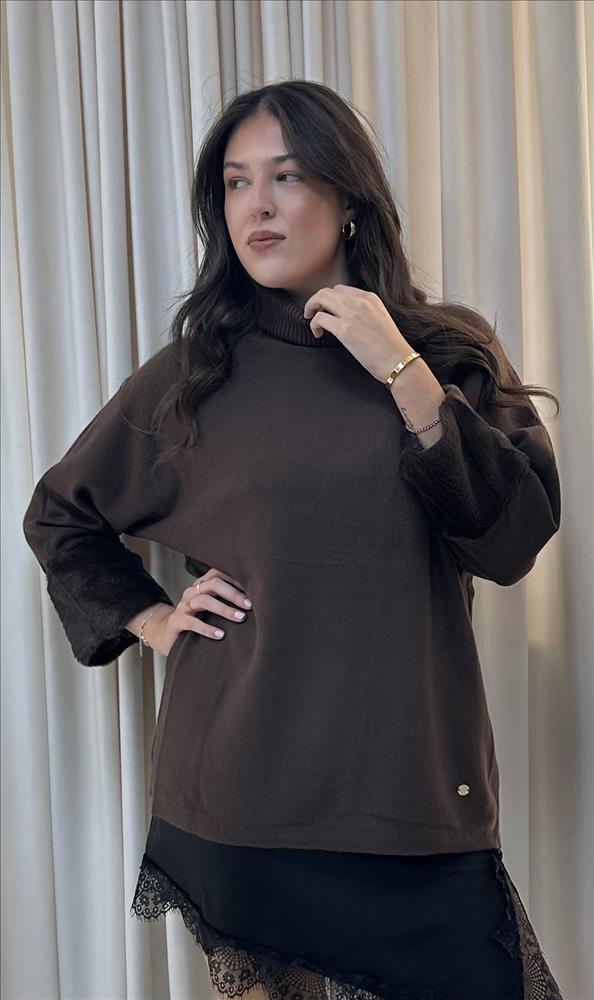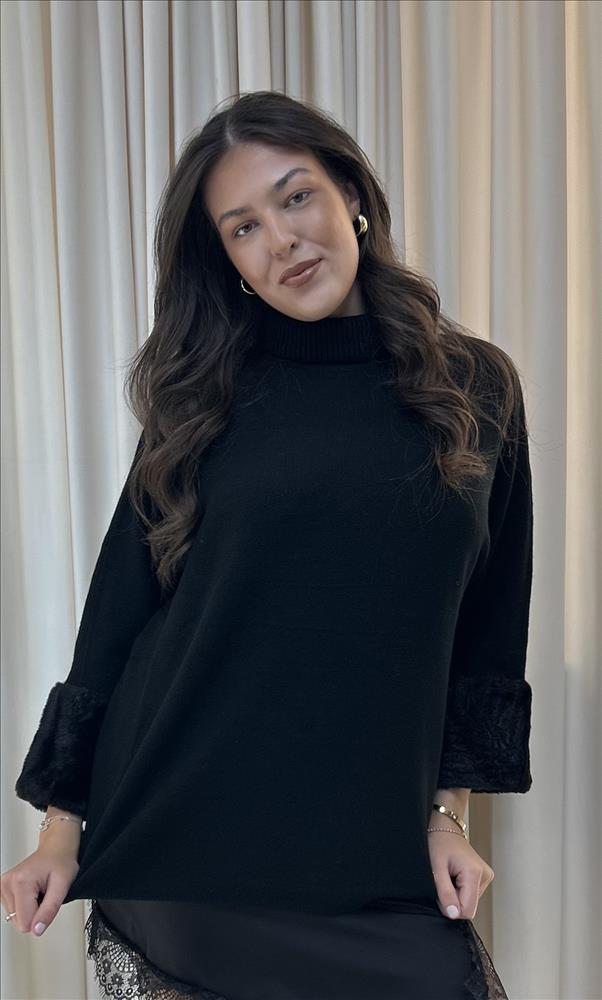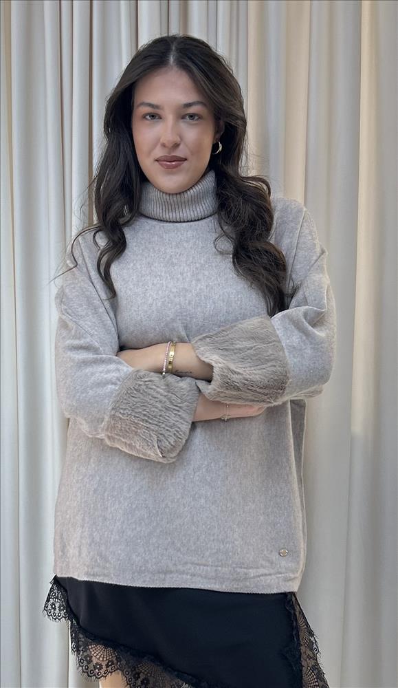 Tento elegantný sveter je ideálnou voľbou pre chladné dni. Mäkký materiál poskytuje maximálne pohodlie a teplo, zatiaľ čo široké rukávy s kožušinovými manžetami dodávajú modelu nádych luxusu. Rolák chráni pred chladom a zároveň pôsobí štýlovo.