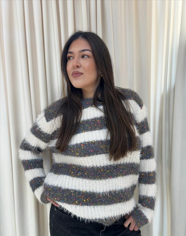 Tento štýlový pulóver s výrazným pruhovaným vzorom kombinuje moderný dizajn s maximálnym pohodlím. Mäkký, nadýchaný úplet je doplnený o drobné farebné nite, ktoré dodávajú svetru originálny a hravý vzhľad. Pulóver má voľnejší strih, príjemne hrejivý materiál a klasický okrúhly výstrih. Ideálny na bežné nosenie počas chladnejších dní – ľahko ho zladíte k džínsom aj elegantnejším nohaviciam.