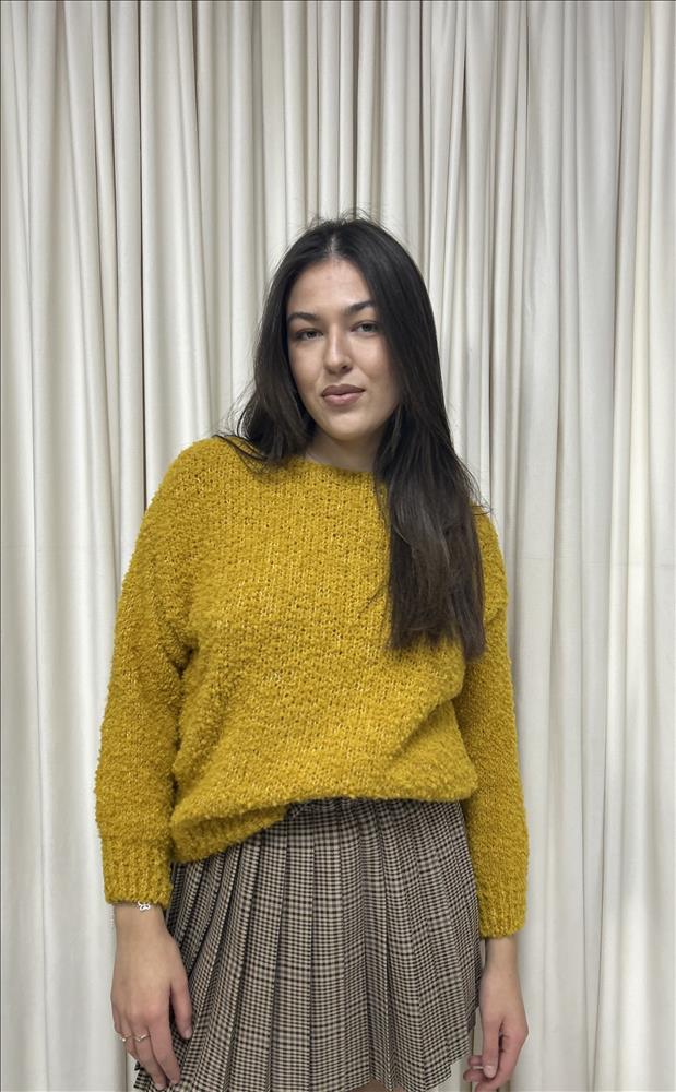 Pulóvrik má voľnejší strih a pôsobí veľmi pohodlne. Výstrih je širší, jemne lodičkový, takže odhaľuje líniu ramien. Rukávy sú dlhé s efektným zakončením – sú mierne nariasené a ukončené hrubším, pleteným patentom, ktorý vytvára ležérne ohrnutý vzhľad. Dolný lem je jednoduchý, rovný, s jemným rebrovaním.