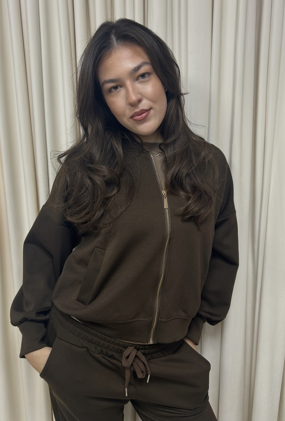 Moderná dámska tepláková súprava v elegantnom tmavohnedom odtieni je ideálnou kombináciou pohodlia a mestského štýlu. Súpravu tvorí mikina na zips s kapucňou a pohodlné nohavice s elastickým pásom, ktoré spolu vytvárajú praktický a nadčasový outfit. Mikina má jednoduchý strih so zapínaním na zips, ktorý umožňuje variabilné nosenie, a elastické manžety pre lepšie prispôsobenie. Nohavice sú doplnené o sťahovaciu šnúrku v páse a praktické bočné vrecká. Mäkký a príjemný materiál zabezpečuje maximálny komfort počas celého dňa – doma, na cestách aj v meste.