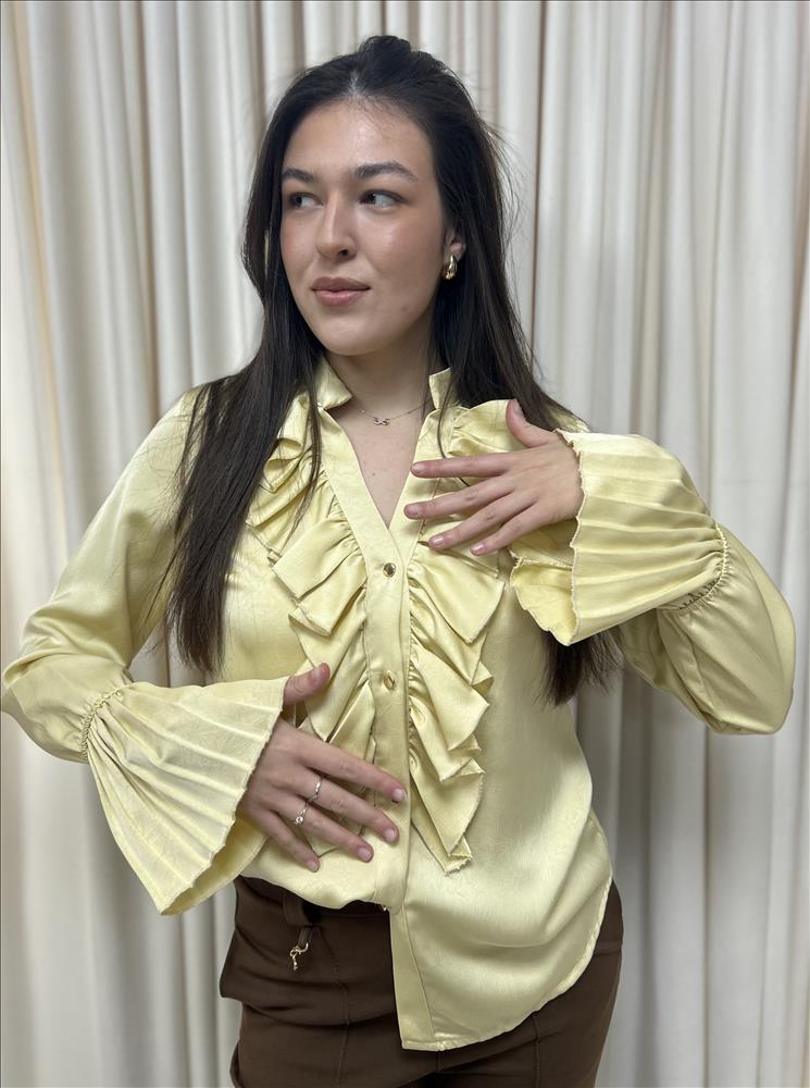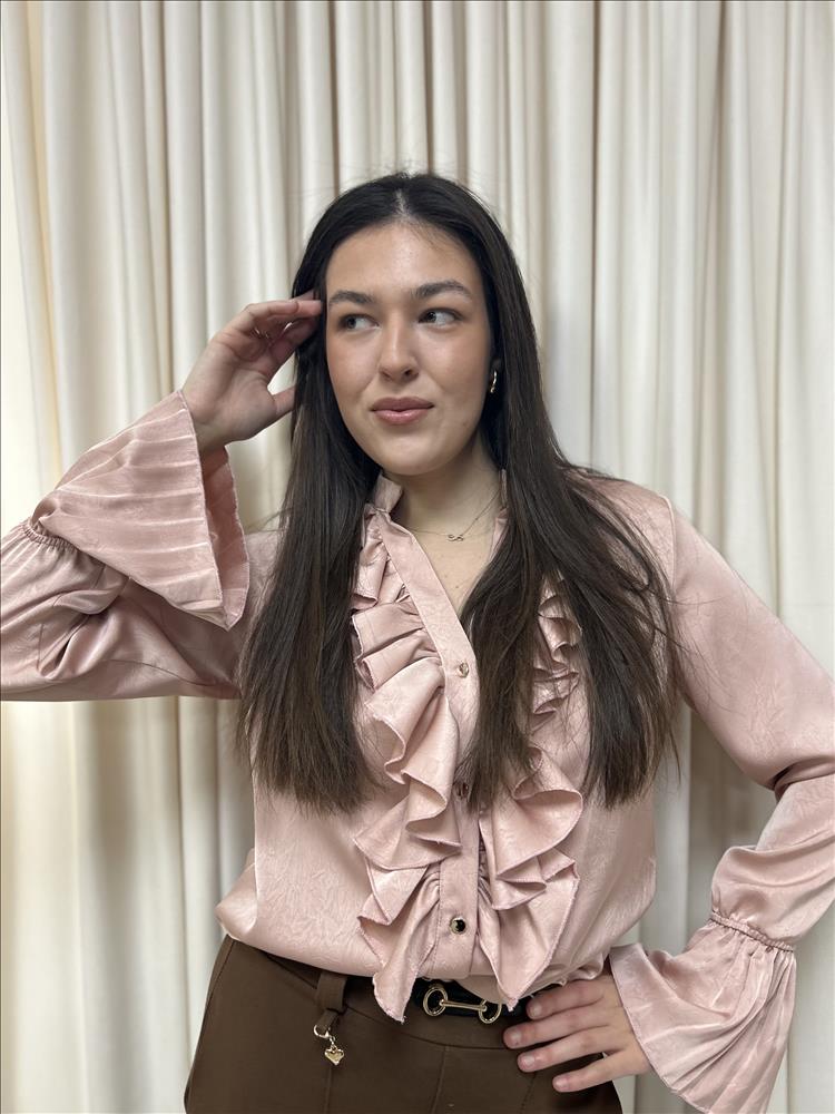 Elegantná saténová blúzka, má pekne naskladané rukávy, zapínanie na zlaté gombíky a predná časť je tiež pekne nariasená. Veľkosť je UNI sedí od XS-L.