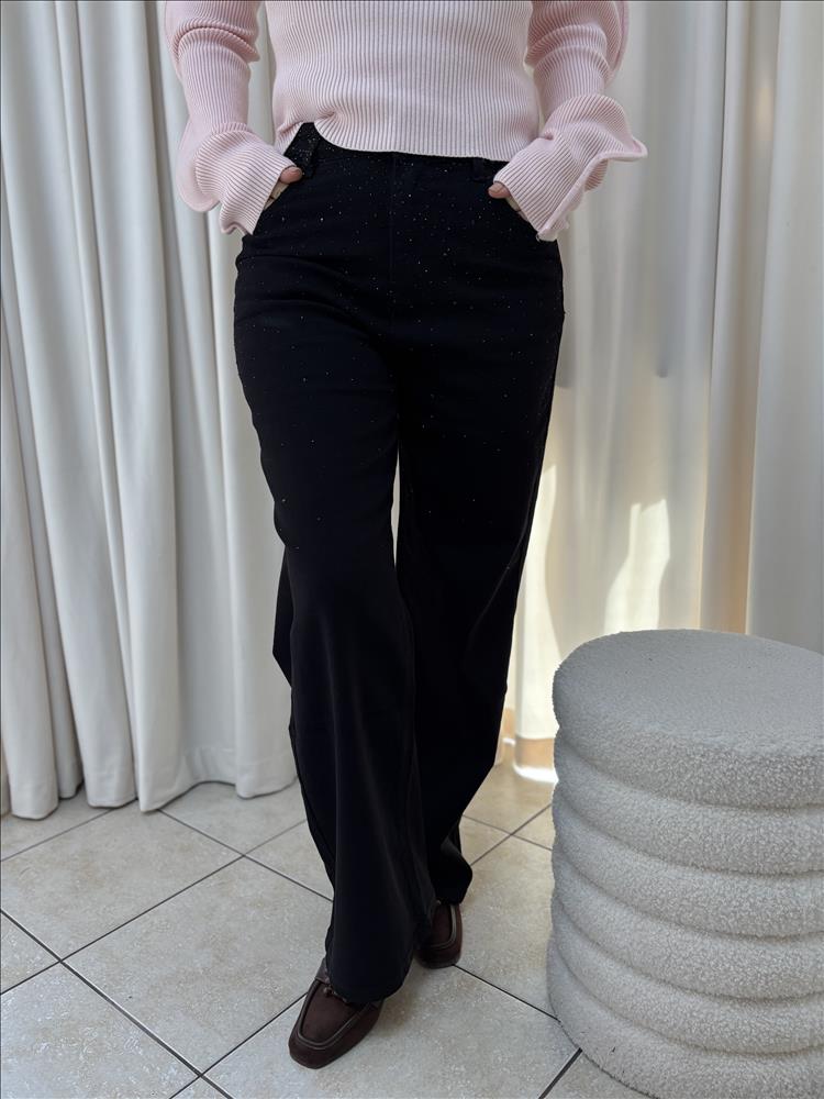 Nadčasové čierne nohavice s decentnými kamienkami dodajú vášmu outfitu jemný nádych luxusu. Minimalistický strih v kombinácii s drobnými kamienkami vytvára dokonalú rovnováhu medzi eleganciou a moderným štýlom. Nohavice majú pohodlný, mierne rovný strih, ktorý lichotí postave a opticky predlžuje nohy. Vďaka kvalitnému materiálu príjemne sedia a sú vhodné na celodenné nosenie – či už do práce, na stretnutie alebo večernú udalosť. Skvelo sa kombinujú s jednoduchým topom či svetrom pre vyvážený, sofistikovaný look.