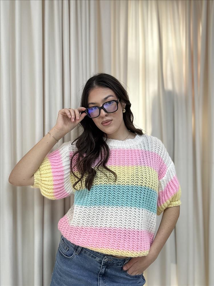 Tento štýlový pletený pulóver v jemných pastelových farbách je ideálnym kúskom na oživenie každodenného outfitu. Kombinácia pruhov v odtieňoch ružovej, žltej, mentolovej a krémovej pôsobí sviežo, hravo a zároveň veľmi žensky. Pulóver má pohodlný, voľnejší strih s krátkymi rukávmi a okrúhlym výstrihom, vďaka čomu sa príjemne nosí a ľahko kombinuje. Hrubšia, vzdušná pletenina dodáva modelu moderný vzhľad a zabezpečuje komfort počas chladnejších dní. Perfektne sa hodí k džínsom, sukni alebo šortkám. Vytvoríte s ním ležérny mestský outfit aj štýlový casual look do práce či na stretnutie s priateľmi.
