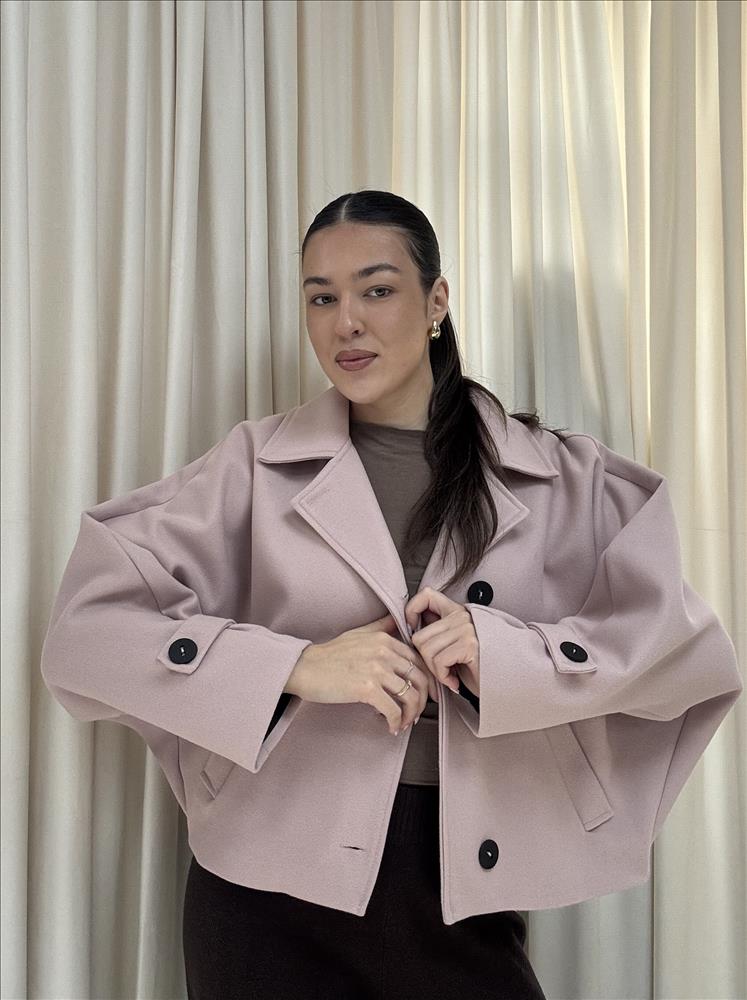 Elegantný krátky kabát je ideálnou voľbou pre prechodné obdobie aj chladnejšie dni. Má moderný, mierne oversized strih so spadnutými ramenami, ktorý pôsobí štýlovo a zároveň pohodlne. Výrazný golier dodáva kabátu sofistikovaný vzhľad a veľké kontrastné gombíky vytvárajú zaujímavý detail. Kabát je doplnený praktickými prednými vreckami a ozdobnými manžetami s gombíkmi. Vďaka kratšej dĺžke sa skvelo kombinuje s nohavicami s vysokým pásom, sukňou aj šatami. Mäkký a príjemný materiál zabezpečuje komfort pri nosení počas celého dňa. Perfektný kúsok do elegantných aj casual outfitov, ktorý oživí každý šatník.