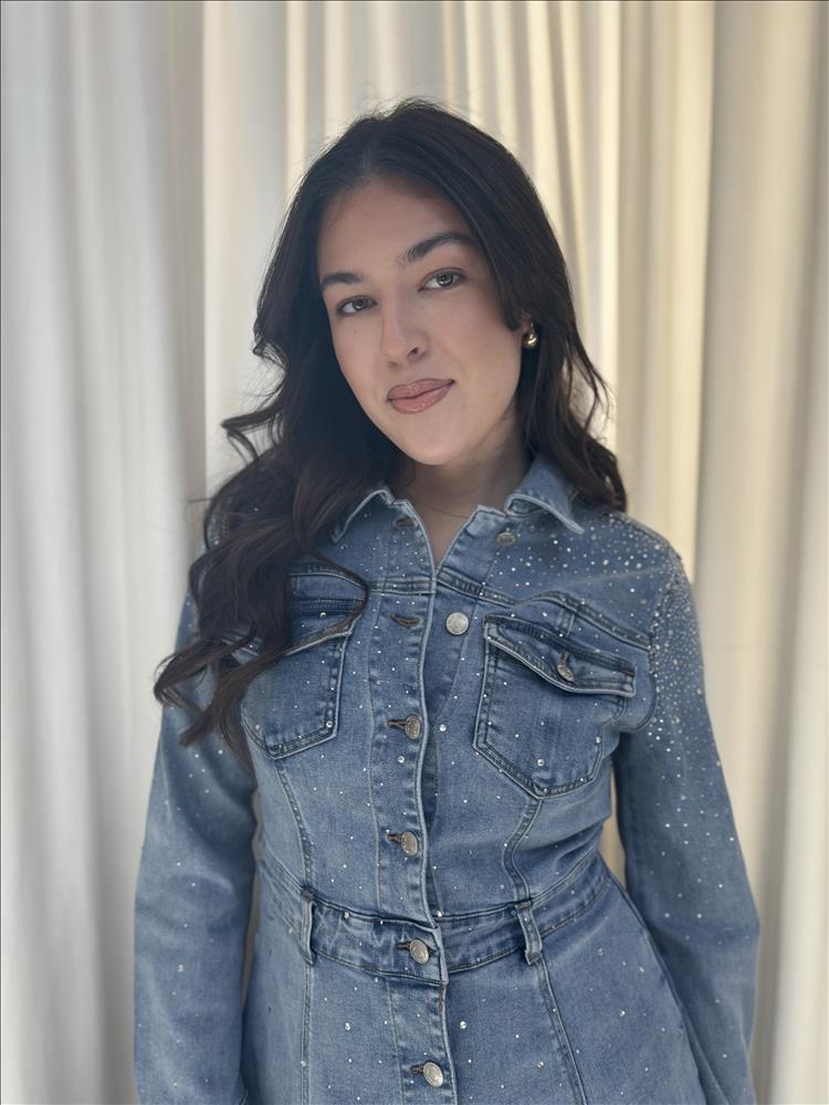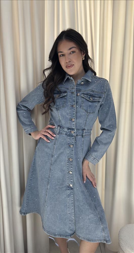 Štýlové džínsové šaty v košeľovom strihu sú dokonalou kombináciou pohodlia a elegancie. Vyrobené z kvalitného denimu, ktorý je zdobený jemnými trblietavými detailmi po celej ploche, dodávajú outfitu sofistikovaný nádych. Šaty majú klasický golier, zapínanie na gombíky po celej dĺžke a praktické náprsné vrecká. Dlhé rukávy sú zakončené manžetami. Vďaka prepracovanému strihu s dôrazom na pás krásne zvýraznia ženskú siluetu a rozšírená sukňová časť pôsobí ľahko a vzdušne. Ideálna voľba na bežné nosenie, do práce aj na spoločenské stretnutia. Stačí doplniť lodičkami pre elegantný look alebo teniskami pre ležérny štýl.