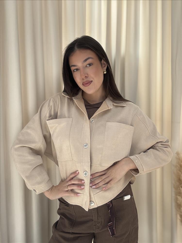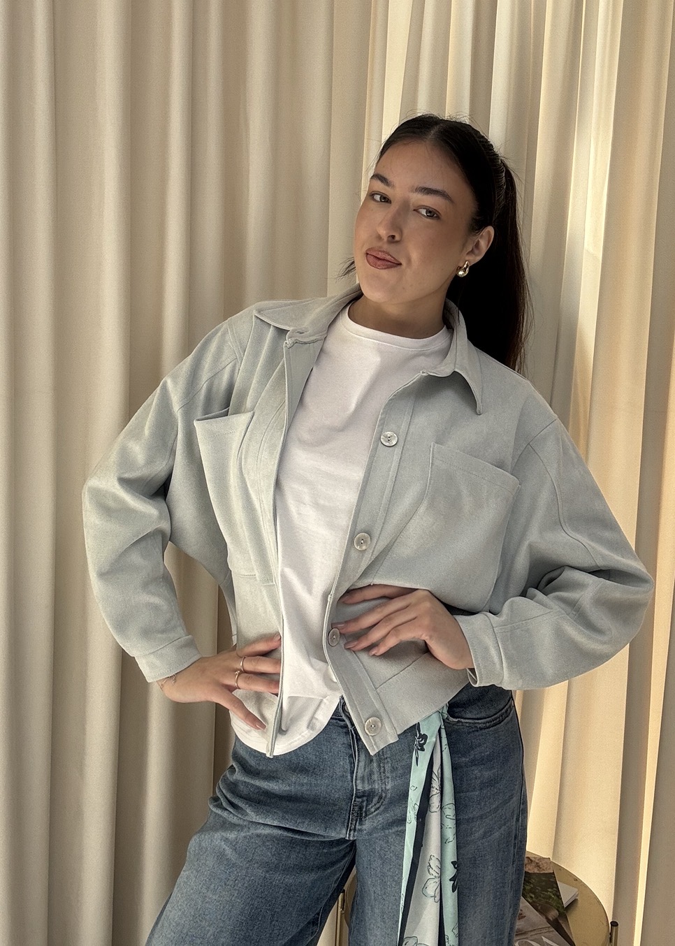 Štýlová krátka bundička je ideálnym kúskom na prechodné obdobie. Má voľnejší, mierne boxy strih, ktorý krásne sadne k nohaviciam s vysokým pásom aj k sukniam. Prednú časť dopĺňajú dve výrazné náprsné vrecká a zapínanie na väčšie kontrastné gombíky, ktoré dodávajú modelu moderný charakter. Jemný, na dotyk príjemný materiál pôsobí luxusne a zároveň pohodlne na každodenné nosenie. Klasický golier a dlhé rukávy z nej robia nadčasový kúsok, ktorý ľahko skombinujete do elegantného aj ležérneho outfitu.