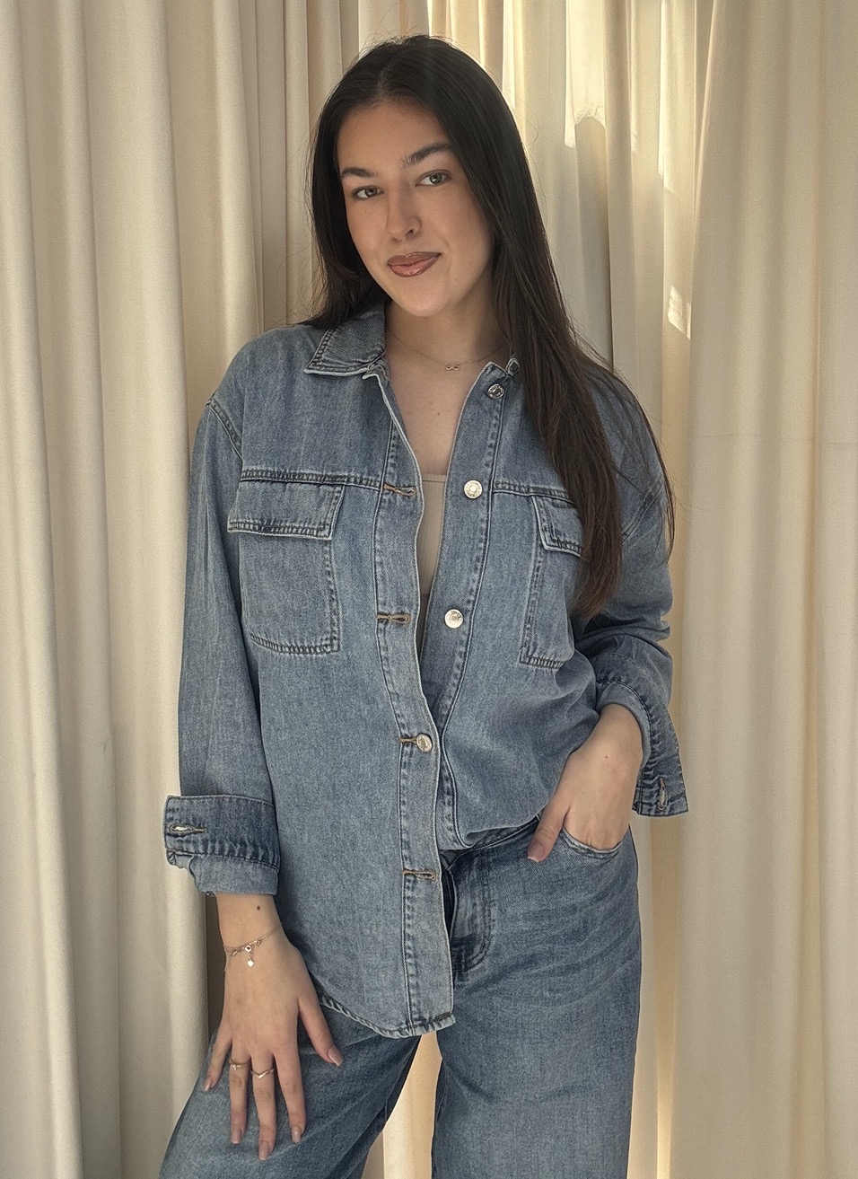 Štýlová dámska džínsová košeľa v svetlomodrom odtieni je ideálnym kúskom pre ležérne aj moderné outfity. Košeľa má voľnejší strih, ktorý zabezpečuje pohodlie počas celého dňa a zároveň pôsobí veľmi trendy. Vyrobená je z kvalitného denimu, ktorý je príjemný na nosenie a ľahko sa kombinuje s rôznymi kúskami v šatníku. Prednú časť dopĺňa zapínanie na gombíky a dve praktické náprsné vrecká, ktoré dodávajú košeli autentický džínsový vzhľad. Dlhé rukávy je možné vyhrnúť pre uvoľnenejší styling. Košeľa sa skvelo hodí k džínsom pre moderný „denim on denim“ look, ale aj k sukni alebo nohaviciam pre každodenný outfit.