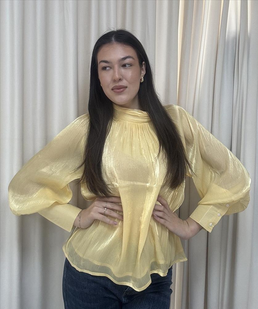 Elegantná dámska blúzka, ktorá zaujme svojím luxusným lesklým materiálom a sofistikovaným dizajnom. Blúzka má jemne riasený vysoký golier, ktorý dodáva modelu ženskosť a elegantný charakter. Voľnejší strih spolu s ľahkým splývavým materiálom zabezpečuje pohodlie počas celého dňa a krásne sa prispôsobí postave. Dlhé rukávy sú zakončené manžetami, ktoré podčiarkujú elegantný vzhľad. Blúzka je ideálnou voľbou na formálne príležitosti, do práce, ale aj na večerné stretnutia. Skvele sa kombinuje s nohavicami, sukňou alebo rifľami pre štýlový moderný outfit.