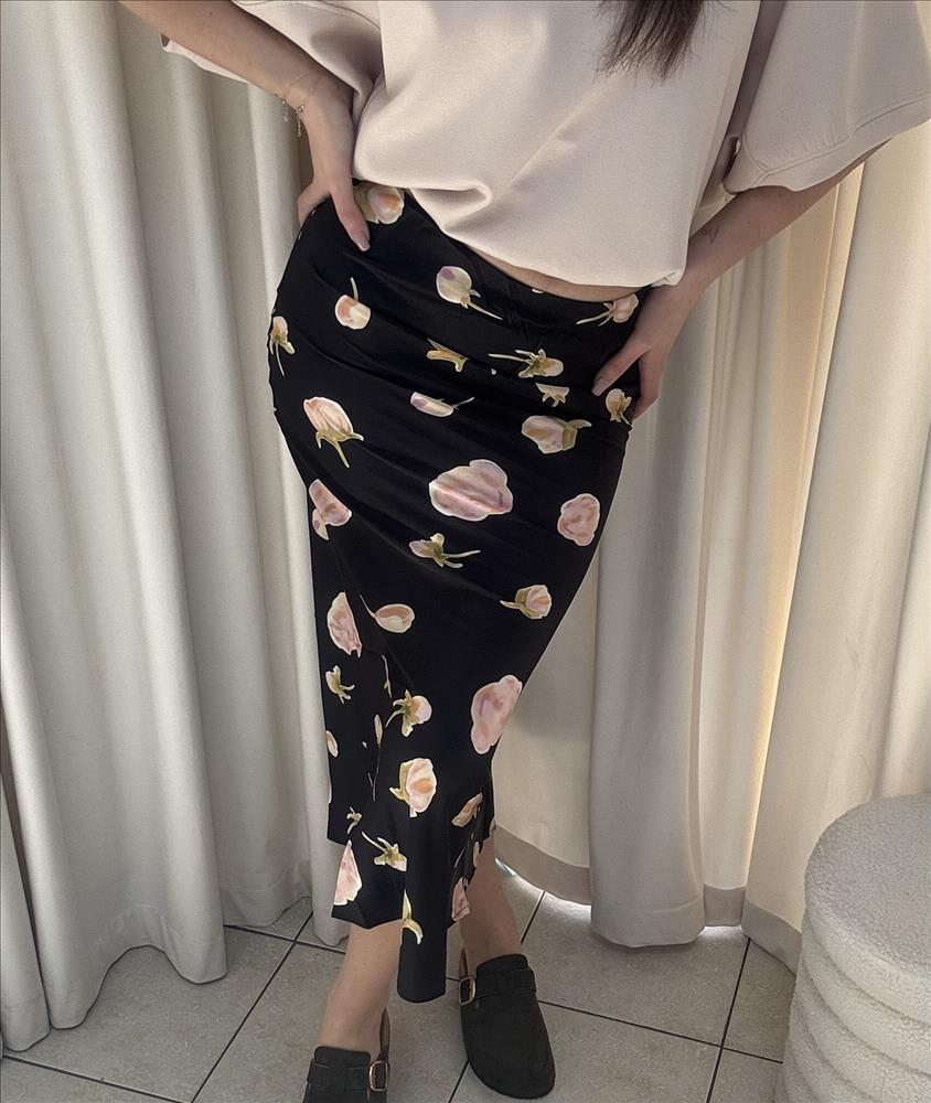Elegantná midi sukňa s jemným kvetinovým vzorom, ktorá pôsobí žensky a nadčasovo. Čierny a žltý podklad je doplnený o romantické pastelové kvety, vďaka čomu sa sukňa stáva výrazným, no stále veľmi ľahko kombinovateľným kúskom. Má priliehavý strih, ktorý krásne zvýrazní siluetu, a jemne rozšírený spodný lem dodáva pohyb a ľahkosť pri chôdzi. Dĺžka pod kolená ju predurčuje na rôzne príležitosti – od bežného dňa až po elegantnejšie outfity. Materiál pôsobí hladko a splývavo, čo zabezpečuje komfort pri nosení a elegantný vzhľad bez námahy.
