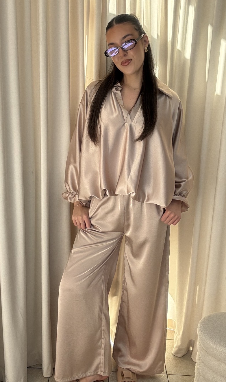 Elegantný saténový komplet v jemnom béžovo-šampanskom odtieni predstavuje dokonalé spojenie pohodlia a nadčasového štýlu. Blúzka má voľný, splývavý strih s dlhými rukávmi zakončenými jemným riasením, ktoré dodáva celku ženský a sofistikovaný vzhľad. Hladký, lesklý materiál pôsobí luxusne a príjemne na dotyk. Nohavice s vysokým pásom a širokými nohavicami krásne predlžujú siluetu a zabezpečujú maximálny komfort pri nosení. Vďaka elastickému pásu sa komplet dokonale prispôsobí postave. Tento set je ideálny na každodenné nosenie aj špeciálne príležitosti – stačí ho doplniť výraznými doplnkami alebo minimalistickými kúskami pre čistý, moderný look.