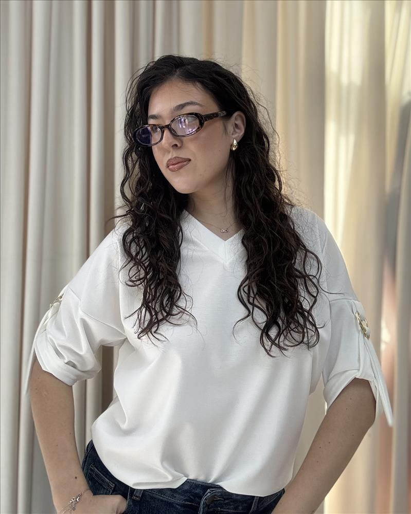Táto elegantná dámska blúzka v nadčasovej bielej farbe je ideálnym kúskom pre každý šatník. Vyniká svojím minimalistickým dizajnom, ktorý ľahko skombinujete s rôznymi outfitmi – od ležérnych až po formálnejšie. Blúzka má voľnejší, pohodlný strih s výstrihom do „V“, ktorý jemne zvýrazňuje dekolt a dodáva ženský vzhľad. Krátke rukávy sú ozvláštnené štýlovými detailmi – jemným prestrihom a dekoratívnou sponou, ktoré pôsobia moderne a originálne. Materiál je ľahký, príjemný na dotyk a ideálny na celodenné nosenie. Vďaka svojmu univerzálnemu vzhľadu sa blúzka skvele hodí k džínsom, nohaviciam aj sukniam – či už do práce, na stretnutie alebo voľný čas.