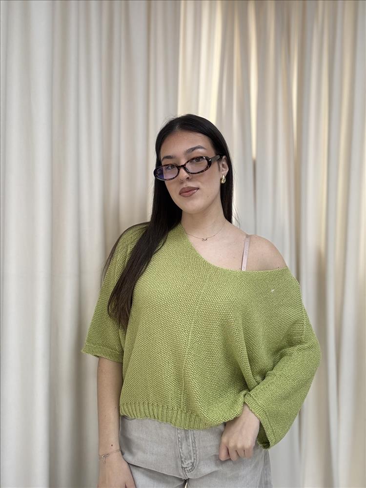 Moderný dámsky sveter vo voľnom, ležérnom strihu, ktorý zaujme svojím pohodlím aj štýlom. Má širší výstrih, ktorý jemne odhaľuje rameno a dodáva outfitu ženský a uvoľnený vzhľad. Krátky, mierne oversize strih spolu s 3/4 rukávmi vytvára vzdušný a trendy siluetu. Pletená štruktúra pôsobí príjemne a dodáva svetru textúru. Svieža zelená farba oživí každý outfit a ľahko sa kombinuje s neutrálnymi kúskami.