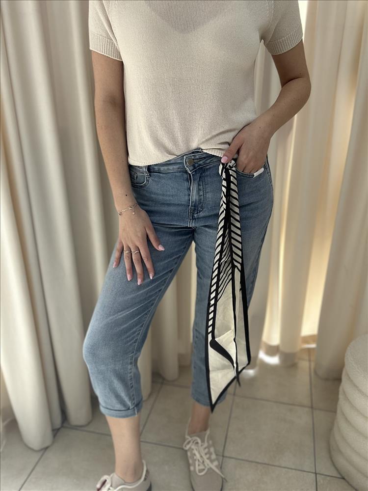 Štýlové dámske rifle, ktoré spájajú pohodlie a nadčasový dizajn. Majú regular strih v 7/8 dĺžke, vďaka čomu pôsobia vzdušne a elegantne zároveň. Svetlý, jemne vyšúchaný denim dodáva modelu ležérny charakter. Rifle majú klasický stredne vysoký pás so zapínaním na zips a gombík, doplnený pútkami na opasok a saténovou šatkou. Minimalistické prevedenie bez výrazných detailov umožňuje jednoduché kombinovanie s rôznymi outfitmi – od casual až po chic štýl.