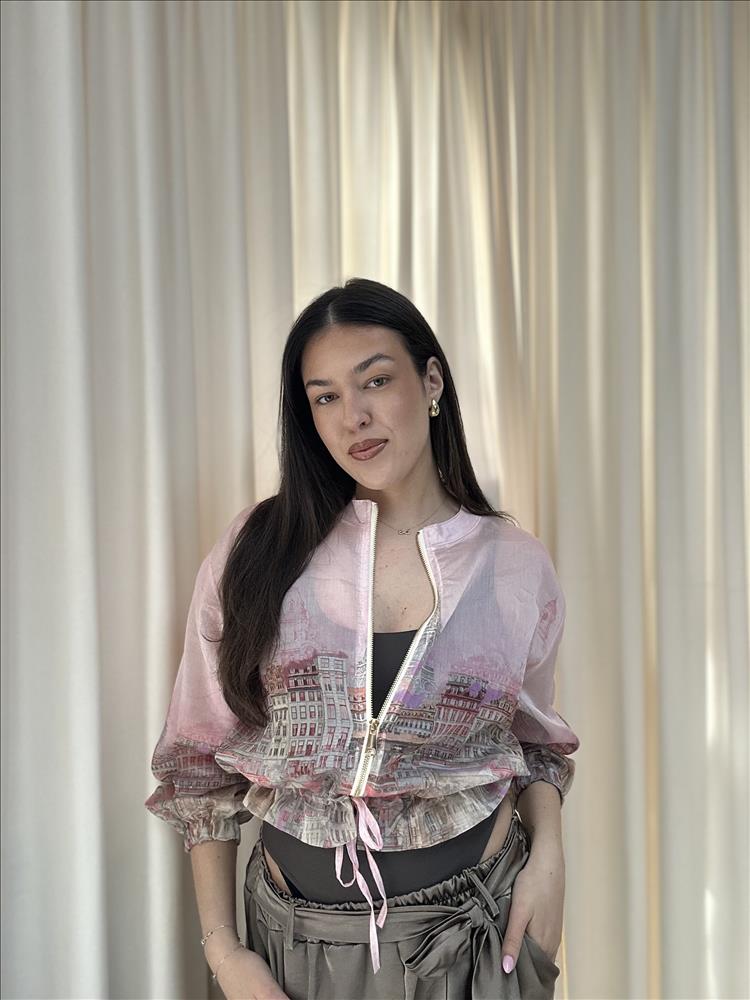 Táto štýlová dámska bundička zaujme na prvý pohľad svojím originálnym dizajnom s rôznou potlačou. Vyrobená z ľahkého, priesvitného materiálu, pôsobí vzdušne a moderne, ideálna na vrstvenie počas jarných a letných dní. Bundička má praktické zapínanie na zips, elastické manžety a spodný lem doplnený o jemné viazanie, ktoré umožňuje prispôsobiť siluetu podľa potreby. Voľnejší strih zaručuje pohodlie pri nosení, zatiaľ čo jemné detaily dodávajú outfitu ženskosť a eleganciu. Perfektne sa kombinuje s jednoduchými topmi alebo šatami a je ideálnou voľbou pre mestský, casual aj trendy look.