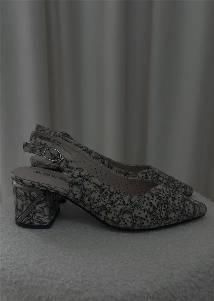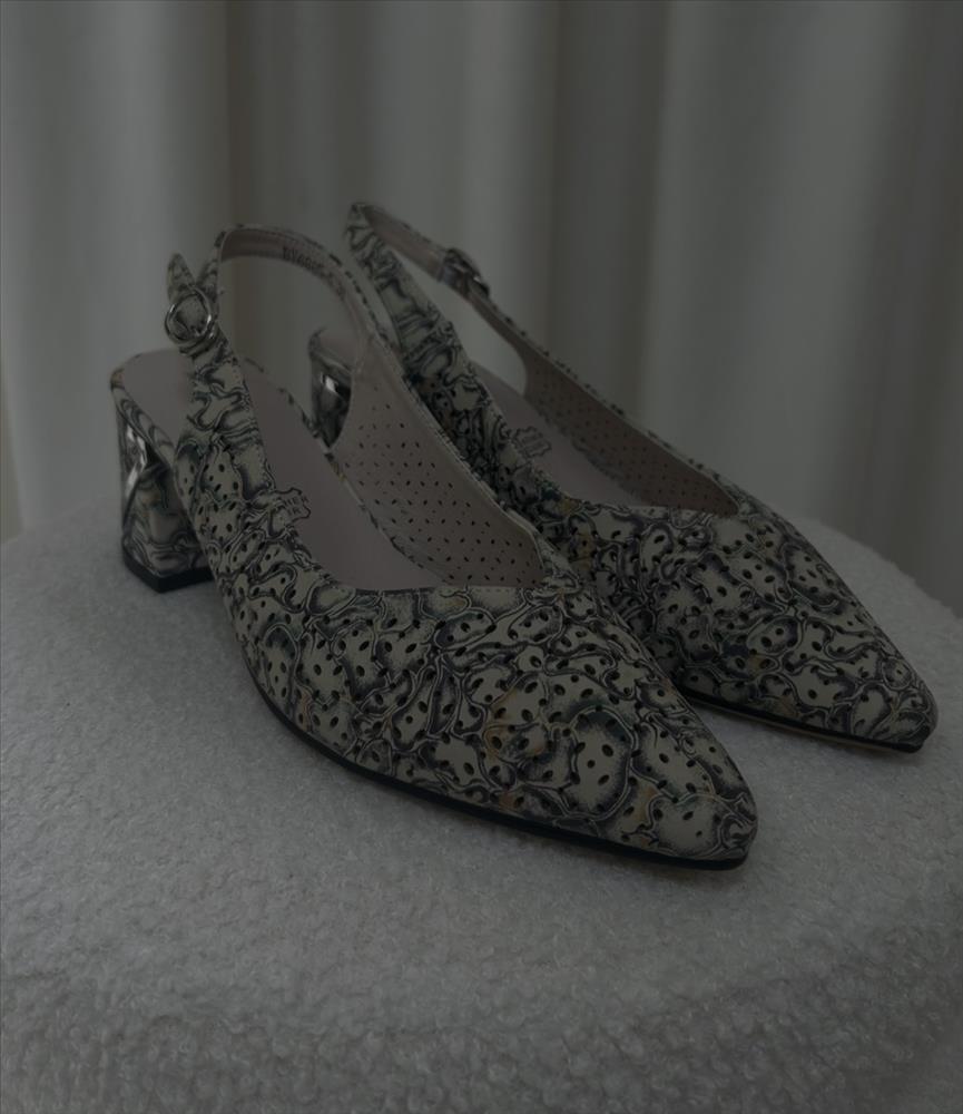 Elegantné dámske lodičky s otvorenou pätou zaujmú na prvý pohľad svojím originálnym dizajnom a výraznou potlačou. Topánky majú stabilný, širší podpätok, ktorý zabezpečuje pohodlie počas celého dňa, a nastaviteľný remienok okolo päty pre lepšie prispôsobenie. Uzavretá špička pôsobí elegantne, zatiaľ čo perforovaný detail zvyšuje priedušnosť a komfort pri nosení. Ideálne na každodenné nosenie do práce, ale aj na špeciálne príležitosti, kde chcete spojiť pohodlie so štýlom.