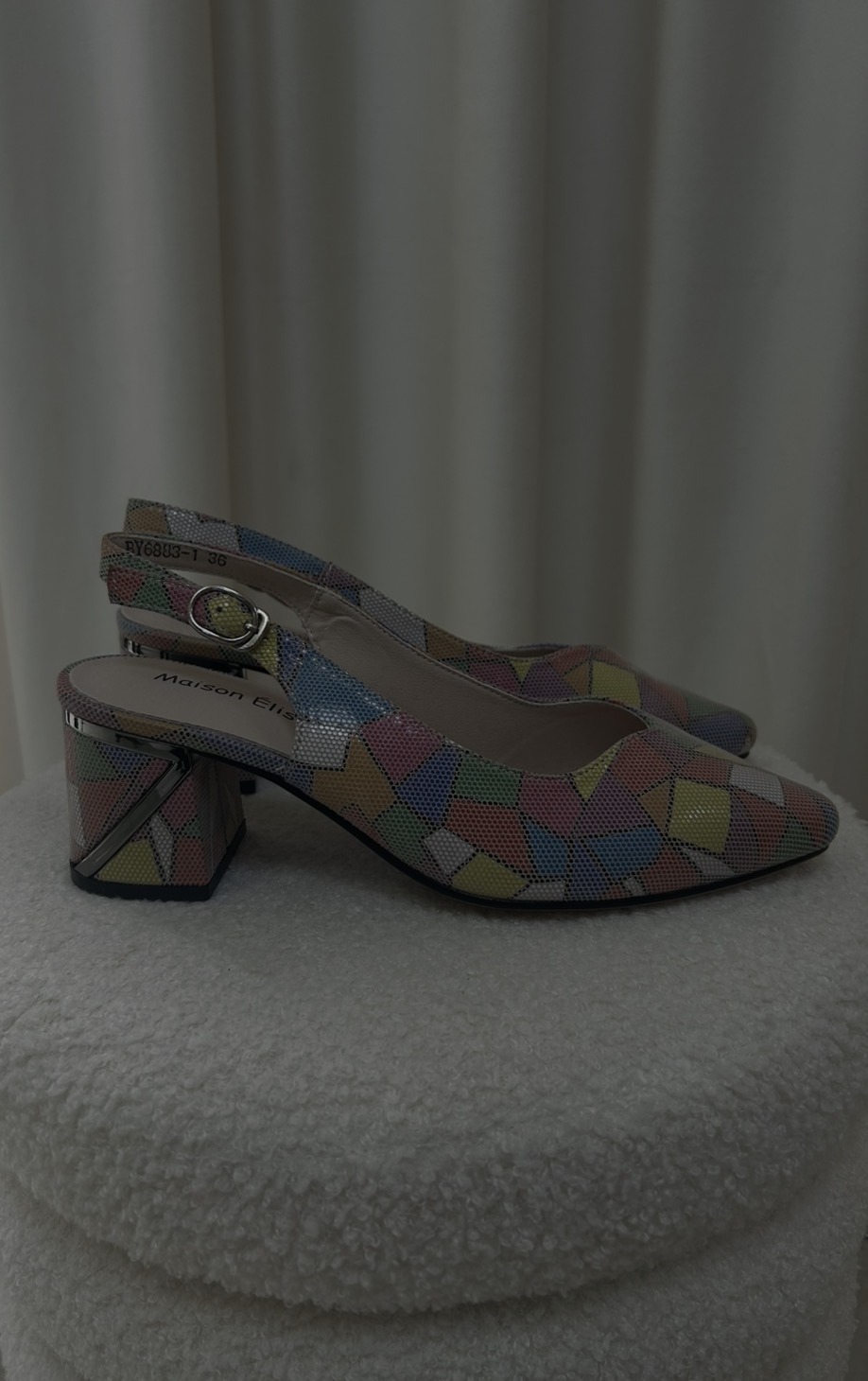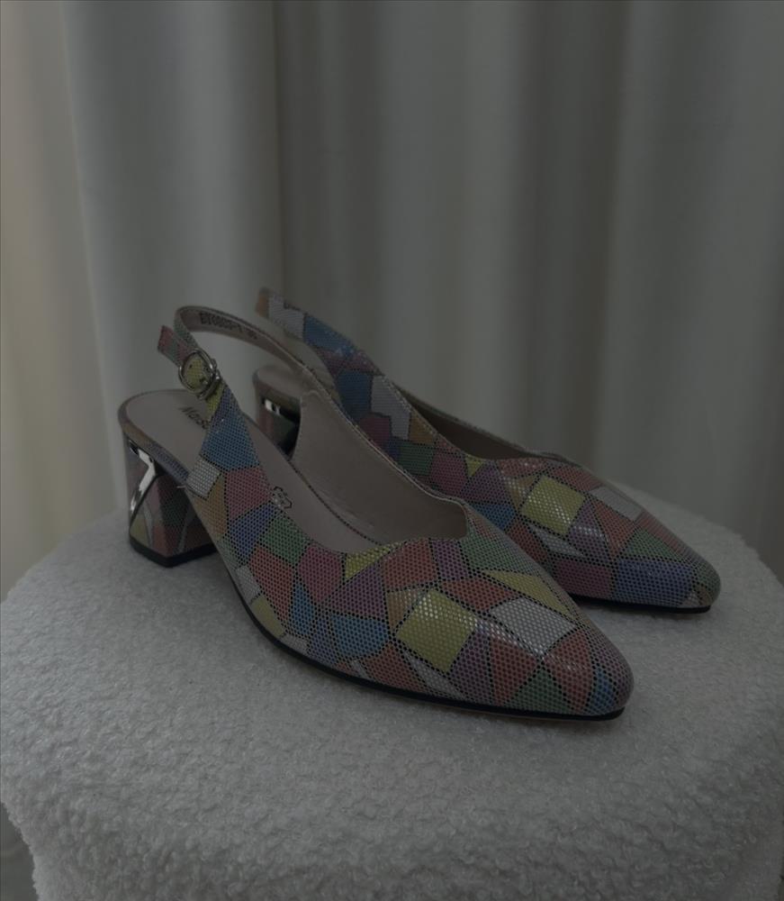 Elegantné dámske lodičky s otvorenou pätou zaujmú na prvý pohľad svojím originálnym dizajnom a výraznou potlačou. Topánky majú stabilný, širší podpätok, ktorý zabezpečuje pohodlie počas celého dňa, a nastaviteľný remienok okolo päty pre lepšie prispôsobenie. Uzavretá špička pôsobí elegantne, zatiaľ čo perforovaný detail zvyšuje priedušnosť a komfort pri nosení. Ideálne na každodenné nosenie do práce, ale aj na špeciálne príležitosti, kde chcete spojiť pohodlie so štýlom.
