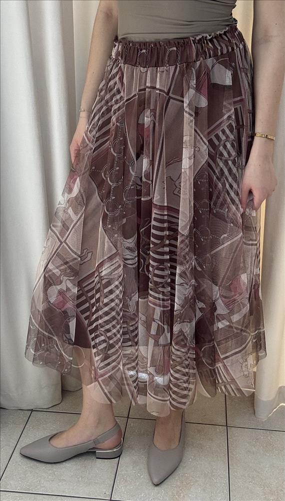Vzdušná plisovaná sukňa s elegantným vzorom v zemitých tónoch, ktorá pôsobí jemne a zároveň výrazne. Transparentná vrchná vrstva s modernou abstraktnou potlačou je doplnená podšívkou, vďaka čomu je sukňa pohodlná na nosenie a zároveň si zachováva ľahkosť. Elastický pás zabezpečuje komfort a prispôsobí sa postave, zatiaľ čo plisovanie dodáva sukni krásny pohyb pri každom kroku. Midi dĺžka robí z tohto kúsku univerzálnu voľbu na bežné nosenie aj elegantnejšie príležitosti.