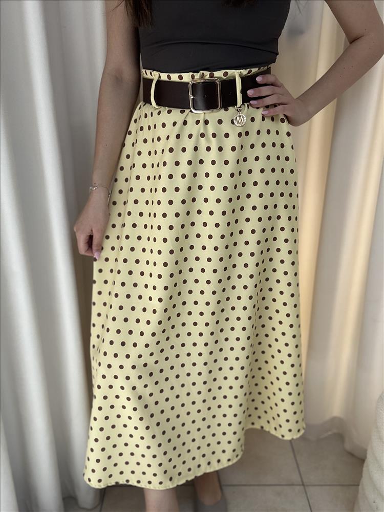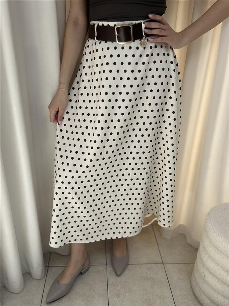 Maxi sukňa s bodkami. Na oboch stranách majú vrecká. Pás majú na gumičku, ktorá sa ti pekne prispôsobí k postave. So širokým opaskom si vieš sukničku prispôsobiť k postave a opasok dodáva k suknčke pekný detail.