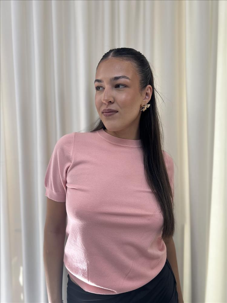 Basic pulóvrik z viskózneho materiálu s krátkym rukávom. Zloženie 50% viskóza, 28% polyester, 22% polyamid.