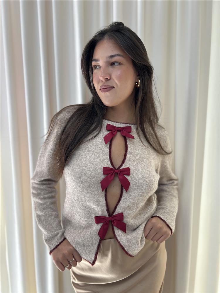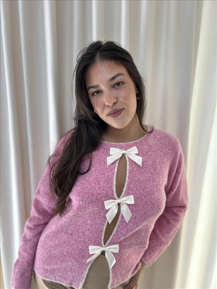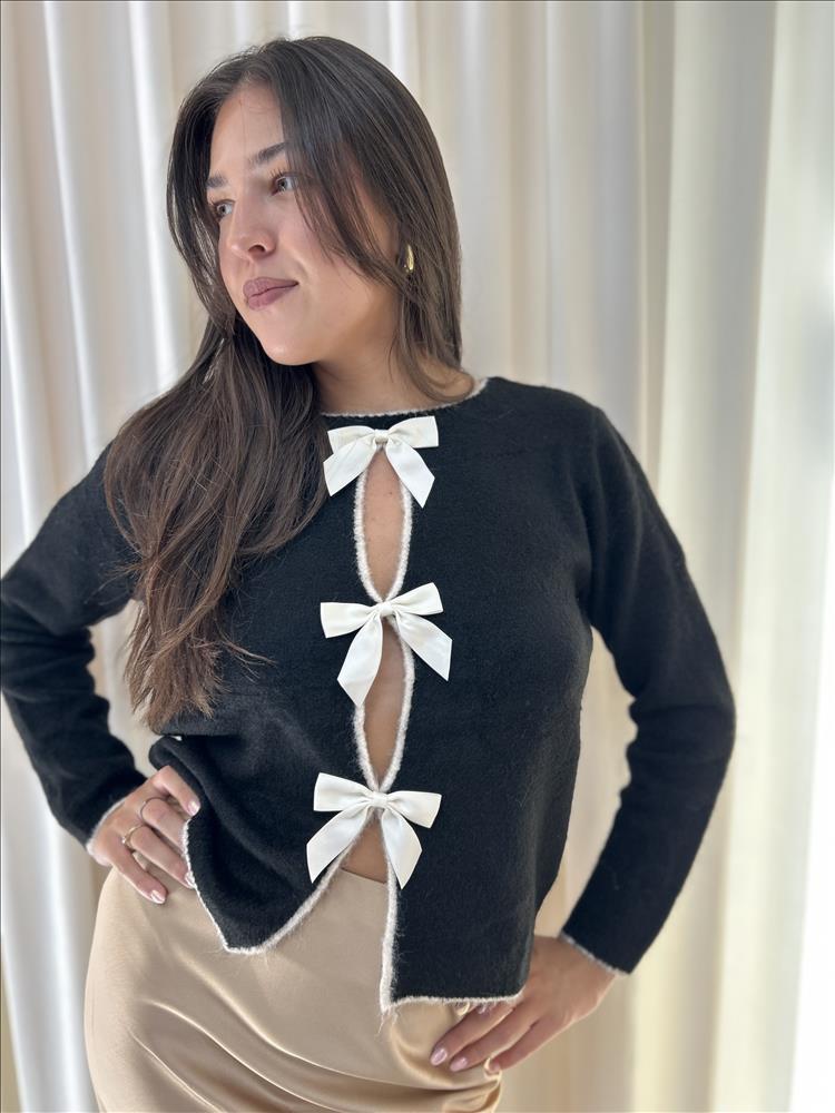 štýlový pulóvrik s mašličkami, ktoré môžete mať ľubovoľne na prednej alebo zadnej strane. Je príjemný a mäkkučký. Veľkosť je UNI, sedí od XS po L.