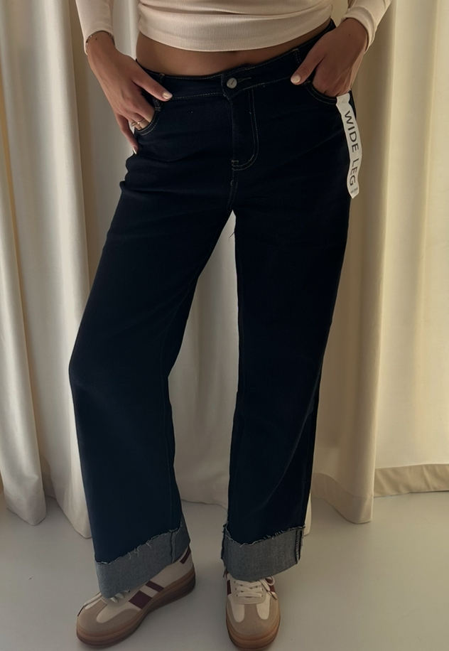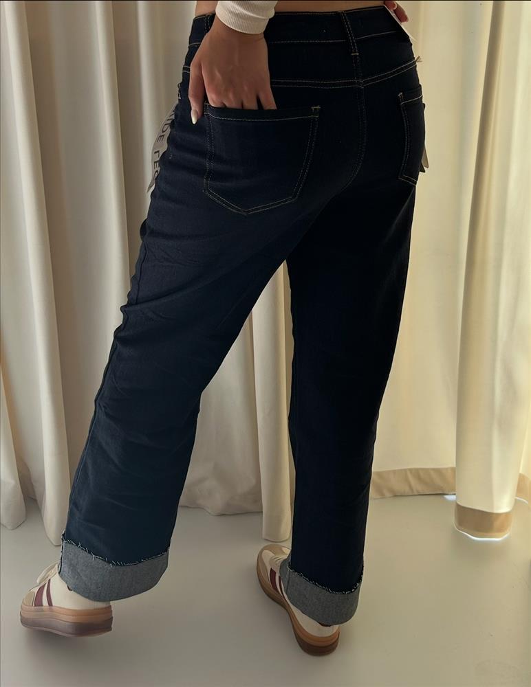 Dámske rifle v tmavomodrom denime spájajú eleganciu s pohodlím. Široký strih pôsobí moderne a zároveň lichotí postave, čím vytvára štýlový a vyvážený vzhľad. Vďaka tmavému odtieňu sú ľahko kombinovateľné a vhodné na každodenné aj elegantnejšie outfity. Skvelý základ do každého šatníka. Rifle sú zakončené vyhynutím patentom.