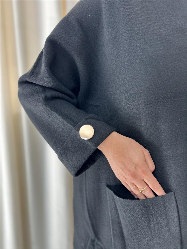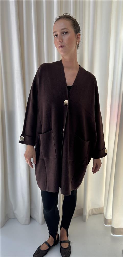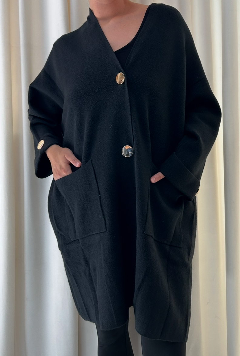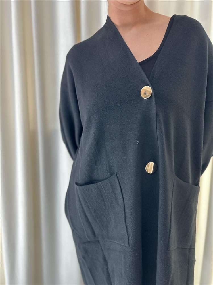 Štýlový kardigán so zlatými gombíkmi a dvomi vreckami.