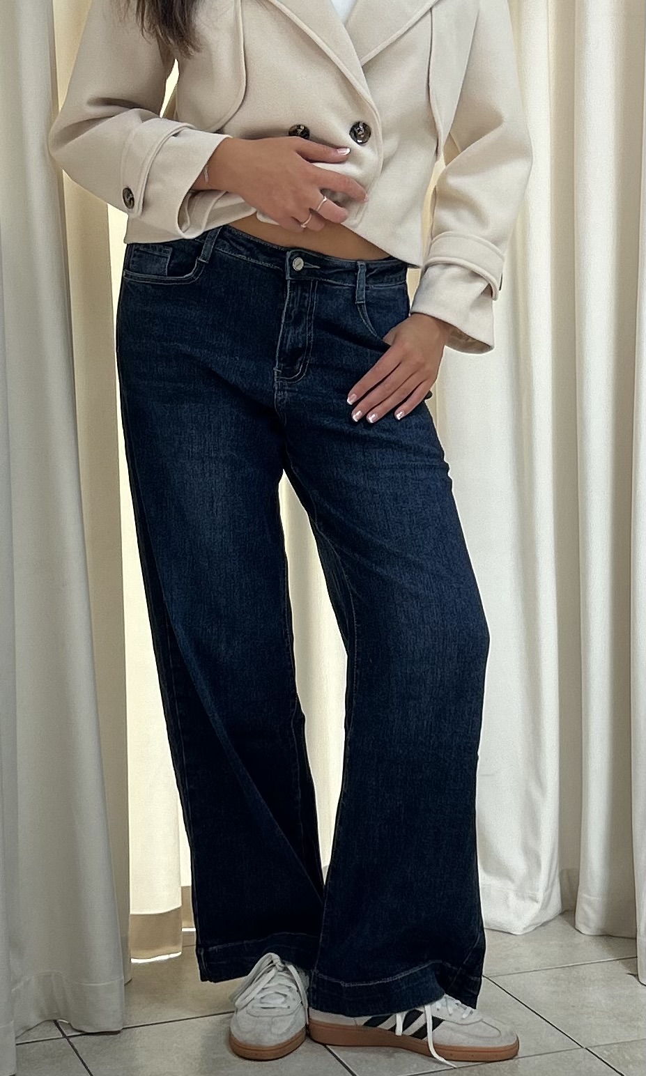 rifle s tmavým denimom, majú rozšírený spodok, dve vrecká vpredu a dve vzadu