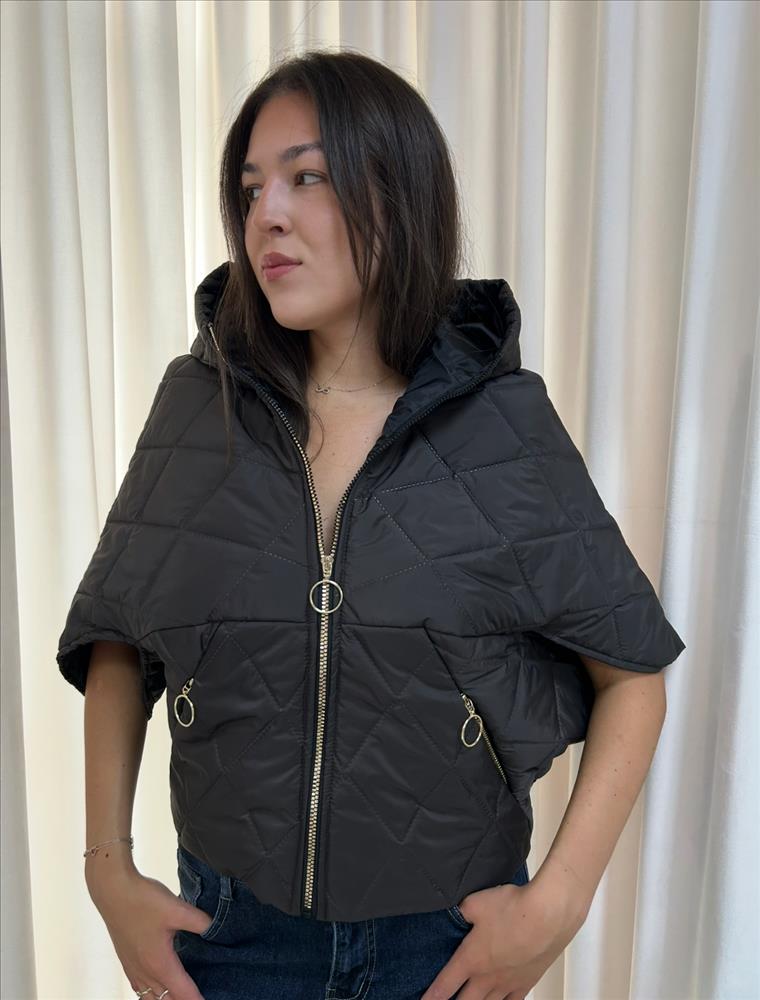 Bundička na fotke je krátka, čierna, prešívaná a má kapucňu. Strih je voľnejší, s kratšími rukávmi, ktoré pôsobia ako pončo. Zapína sa na zips so zlatým krúžkom a rovnaké krúžky sú aj na vreckách. Materiál vyzerá ako lesklý, ľahko nafúknutý, čo jej dodáva „puffer“ vzhľad.