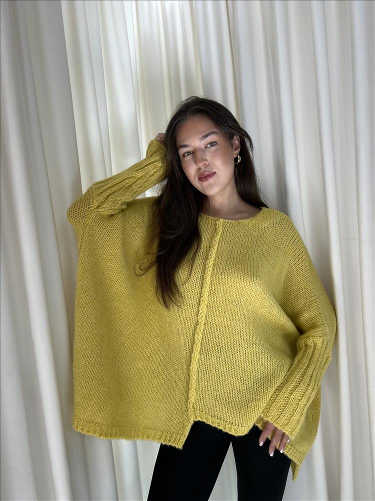 Sveter má oversize strih, spadnuté ramená a dlhé rukávy s rebrovaným zakončením. Vpredu je zaujímavý detail – zvislý pletený vzor, ktorý ide pozdĺž stredovej línie. Dolný lem je mierne asymetrický, s malými rozparkami na bokoch. Materiál pôsobí mäkko a útulne, ideálny na chladnejšie dni.