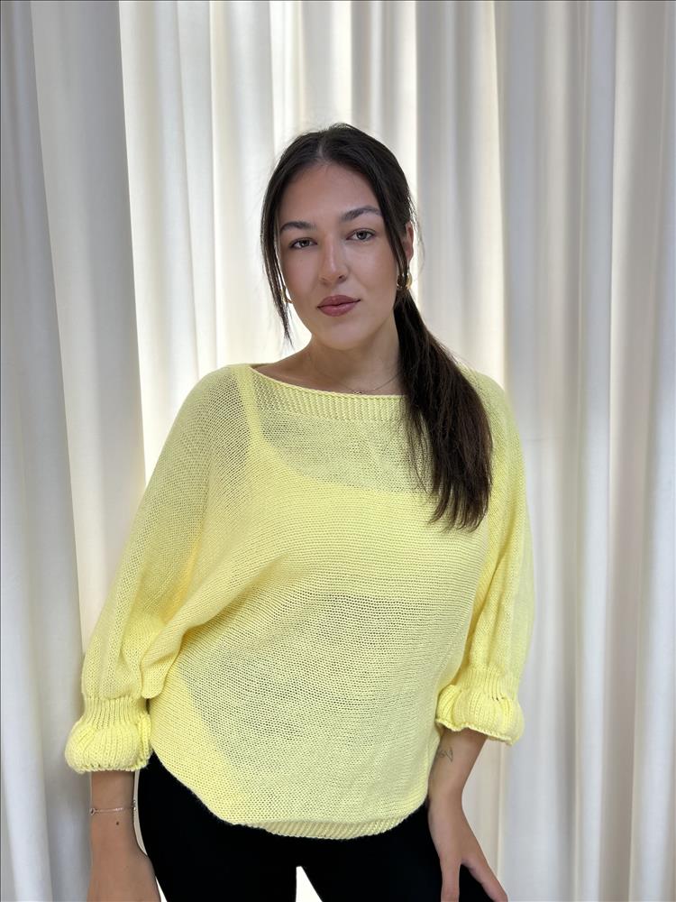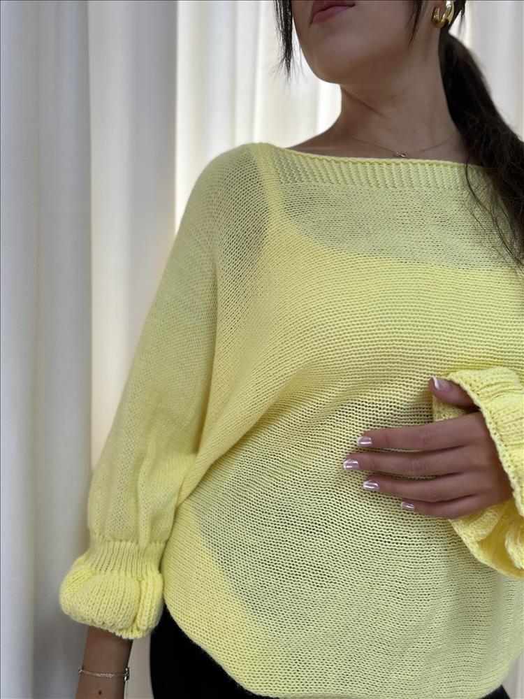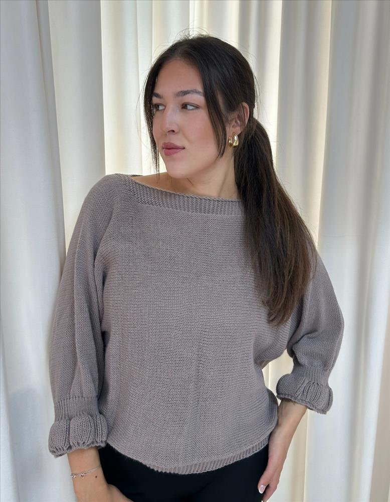 Sveter má voľnejší strih a pôsobí veľmi pohodlne. Výstrih je širší, jemne lodičkový, takže odhaľuje líniu ramien. Rukávy sú 3/4 dĺžky s efektným zakončením – sú mierne nariasené a ukončené hrubším, pleteným patentom, ktorý vytvára ležérne ohrnutý vzhľad. Dolný lem je jednoduchý, rovný, s jemným rebrovaním.