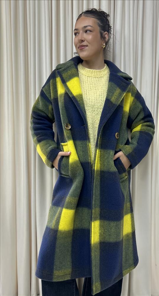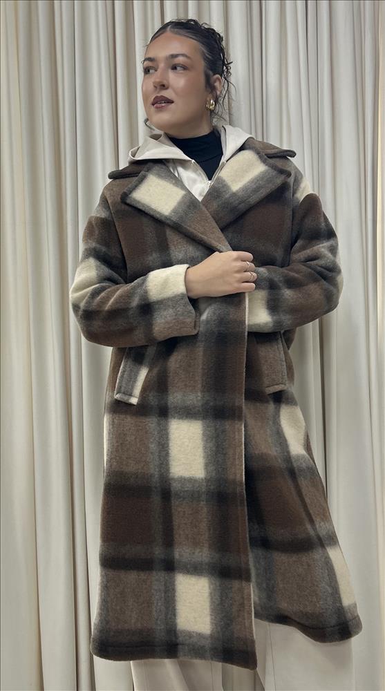 Dlhý károvaný kabát, z vnútornej strany podšitý. Na oboch stranách ma vrecká a gombíky na zapínanie.