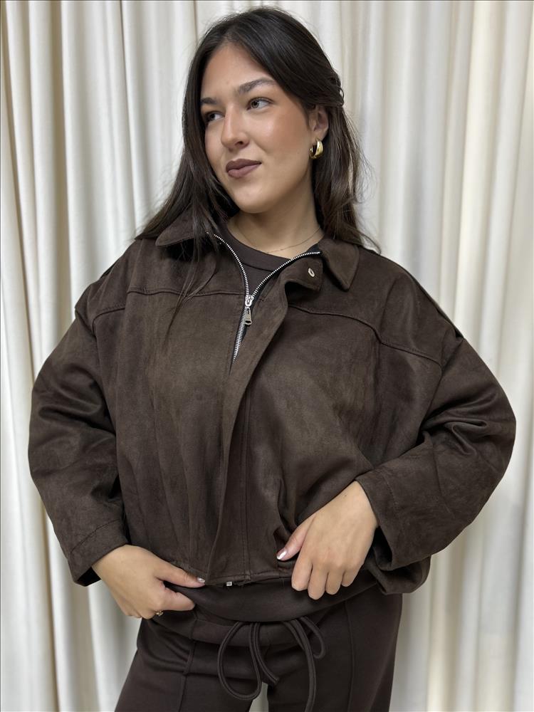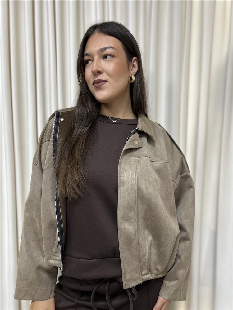 Semišová bunda s golierom. Štýlová a univerzálna bunda, ktorá kombinuje ležérny vzhľad s nádychom elegancie. Vyrobená z jemného semišového materiálu pôsobí nadčasovo a ľahko sa kombinuje s rôznymi outfitmi. Zapínanie na zips doplnené o cvoky dodáva bunde moderný detail a praktickosť. Vďaka príjemnému materiálu poskytuje komfort počas celého dňa, dodá outfitu šmrnc a štýlovú uvoľnenosť.