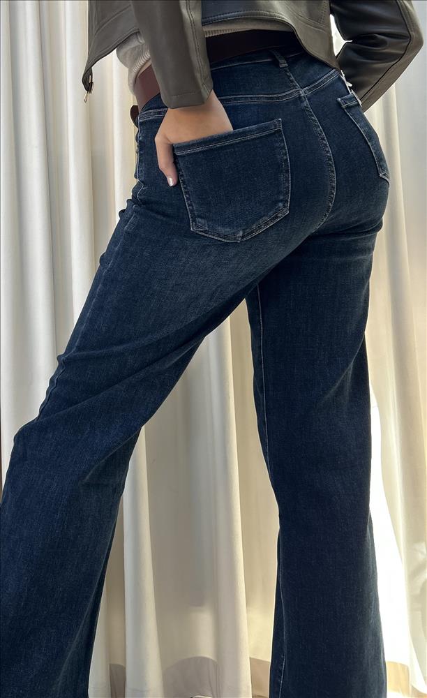 rifle s tmavým denimom, majú rozšírený spodok, dve vrecká vpredu a dve vzadu, opasok je v cene