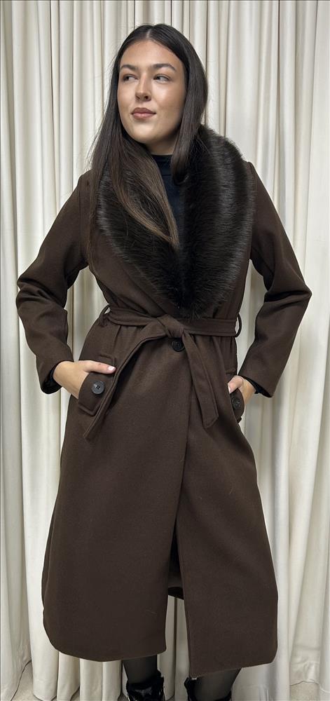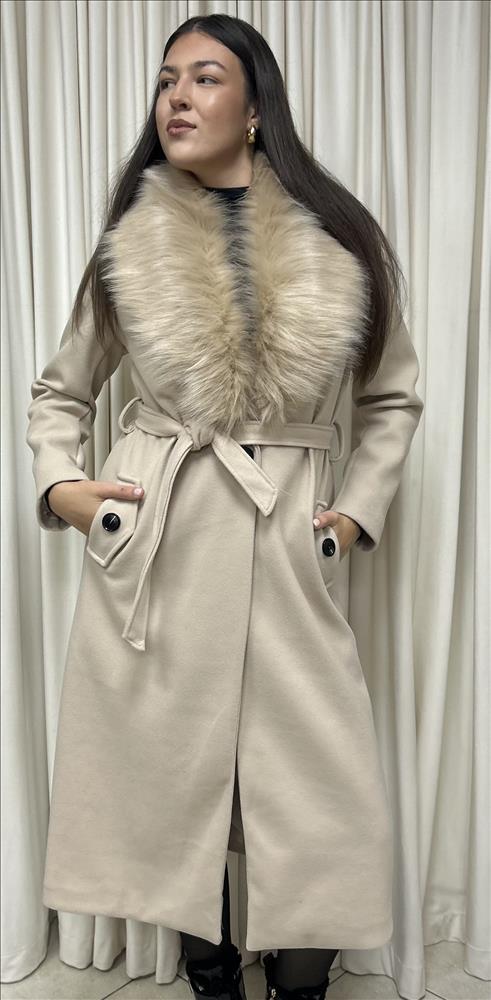 Dlhý, štýlový kabát s odnímateľným kožušinovým límcom, má jednoradové zapínanie, v páse si ho viete prispôsobiť s opaskom, vrecká má zdobené gombíkom. Kožušinový límec je krásny, výrazný a príjemne hebký na dotyk. Veľkosť je UNI, sedí od S-L.