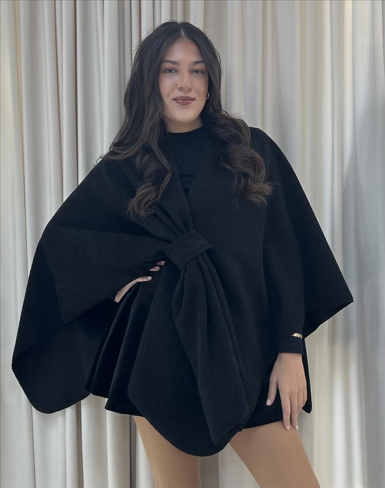 Toto štýlové pončo je dokonalým spojením elegancie a pohodlia. Vyrobené z mäkkého, hrejivého materiálu, krásne sadne na každý typ postavy. Voľný strih s viazaním v páse zvýrazní siluetu a dodá outfitu sofistikovaný vzhľad.