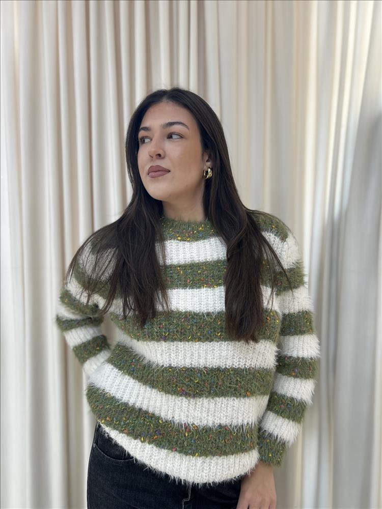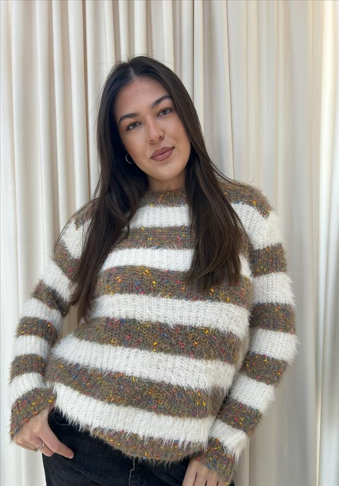 Tento štýlový pulóver s výrazným pruhovaným vzorom kombinuje moderný dizajn s maximálnym pohodlím. Mäkký, nadýchaný úplet je doplnený o drobné farebné nite, ktoré dodávajú svetru originálny a hravý vzhľad. Pulóver má voľnejší strih, príjemne hrejivý materiál a klasický okrúhly výstrih. Ideálny na bežné nosenie počas chladnejších dní – ľahko ho zladíte k džínsom aj elegantnejším nohaviciam.