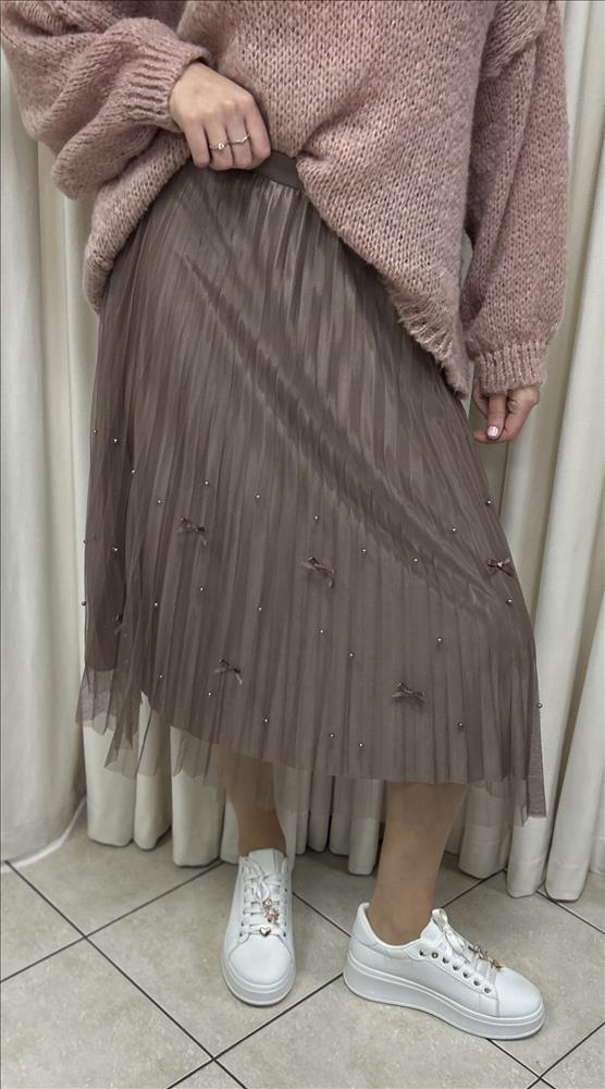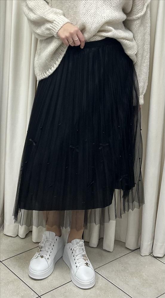 Elegantná a romantická tylová plisovaná sukňa. Sukňa je ušitá z ľahkého, vzdušného tylu s jemnými plisami, ktoré krásne splývajú pri pohybe. Povrch zdobia drobné perličky a mašličky, vďaka ktorým pôsobí žensky a luxusne. Má elastický pás, ktorý sa pohodlne prispôsobí postave, a podšívku, ktorá zaručuje komfort pri nosení. Dĺžka je midi, vhodná na každodenné nosenie aj slávnostnejšie príležitosti. Skvelo sa kombinuje so svetrami, blúzkami aj teniskami či členkovými topánkami.