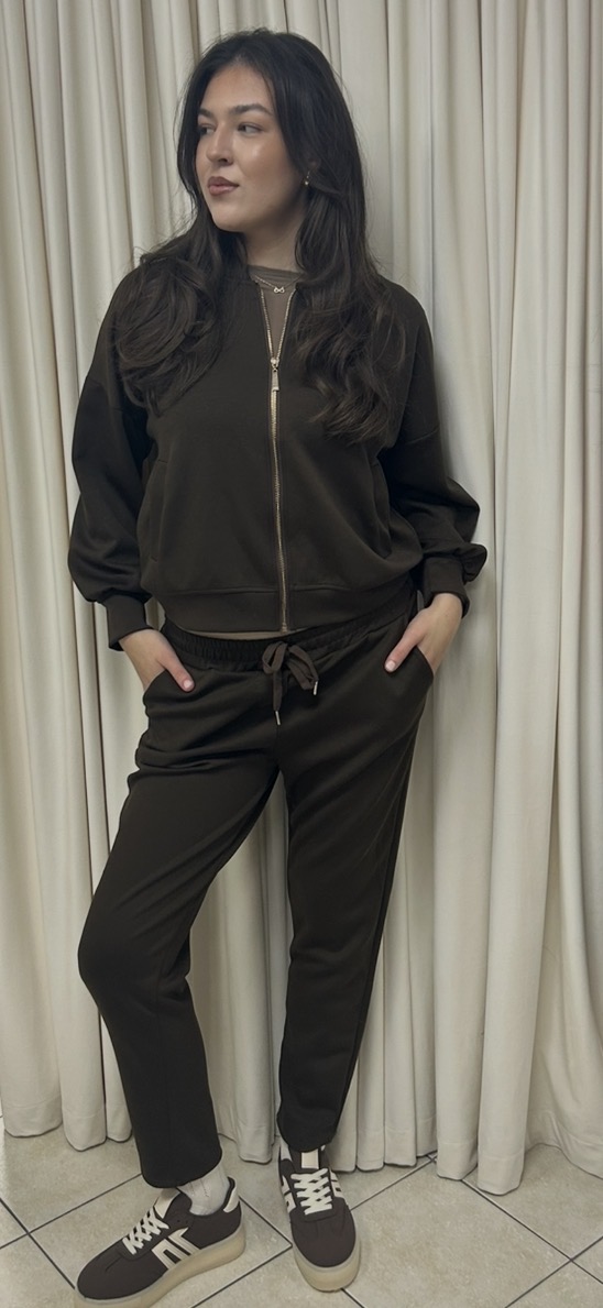 Moderná dámska tepláková súprava v elegantnom tmavohnedom odtieni je ideálnou kombináciou pohodlia a mestského štýlu. Súpravu tvorí mikina na zips s kapucňou a pohodlné nohavice s elastickým pásom, ktoré spolu vytvárajú praktický a nadčasový outfit. Mikina má jednoduchý strih so zapínaním na zips, ktorý umožňuje variabilné nosenie, a elastické manžety pre lepšie prispôsobenie. Nohavice sú doplnené o sťahovaciu šnúrku v páse a praktické bočné vrecká. Mäkký a príjemný materiál zabezpečuje maximálny komfort počas celého dňa – doma, na cestách aj v meste.