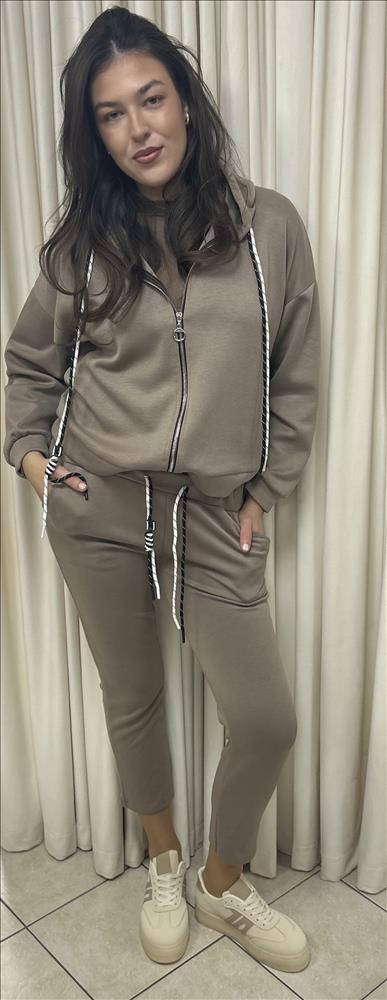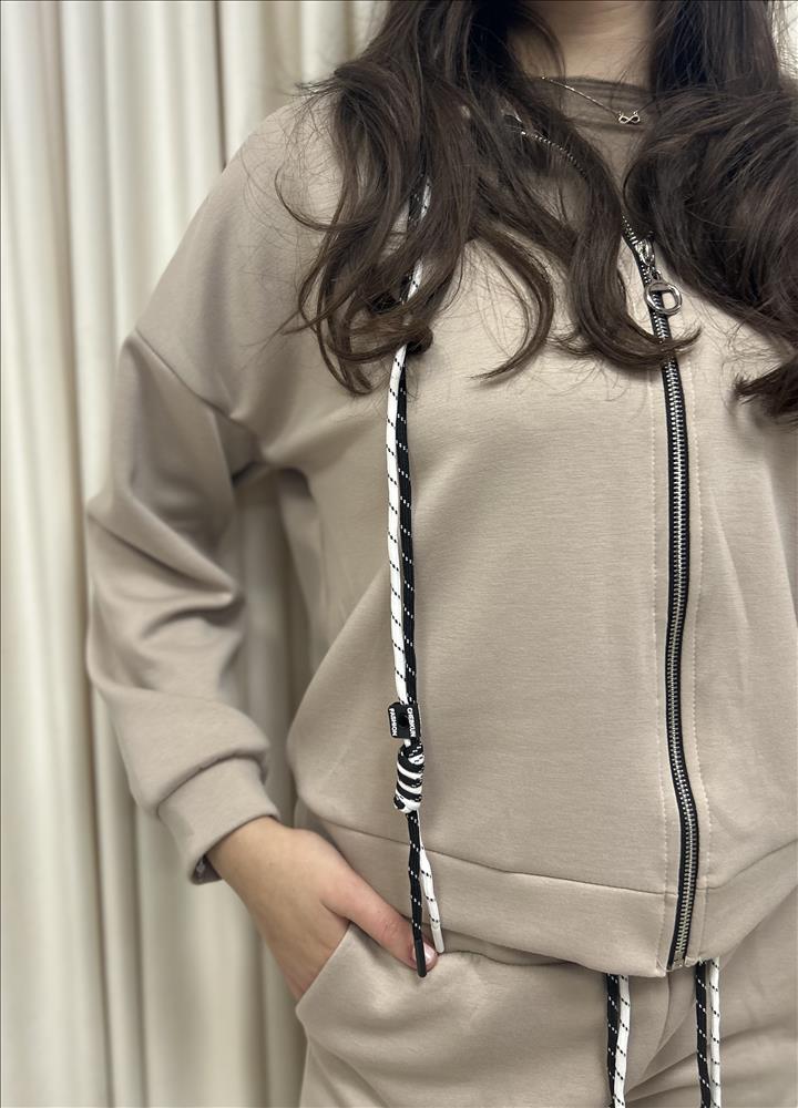Elegantná a pohodlná dámska tepláková súprava je ideálnou voľbou na každodenné nosenie. Súpravu tvorí mikina na zips s kapucňou a nohavice v komfortnom strihu, ktoré spolu vytvárajú štýlový a nadčasový outfit. Mikina je doplnená o kontrastné šnúrky, ktoré dodávajú moderný vzhľad, a praktické vrecká. Elastické manžety zabezpečujú pohodlné nosenie, zatiaľ čo kvalitný a príjemný materiál poskytuje komfort počas celého dňa. Nohavice majú elastický pás so sťahovacou šnúrkou a bočné vrecká pre maximálnu funkčnosť.