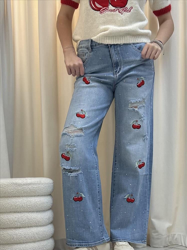 Tieto dámske rifle s rovným strihom zaujmú originálnym a hravým dizajnom. Svetlomodrý denim je zdobený výšivkami čerešní a jemnými trblietavými kamienkami, ktoré dodávajú nohaviciam jedinečný a trendy vzhľad. Model má klasický pás so zapínaním na zips a gombík, pevný denimový materiál a rovné, mierne voľnejšie nohavicepre pohodlné nosenie. Štýlové dekoratívne trhanie na prednej strane vytvára moderný, ležérny efekt.