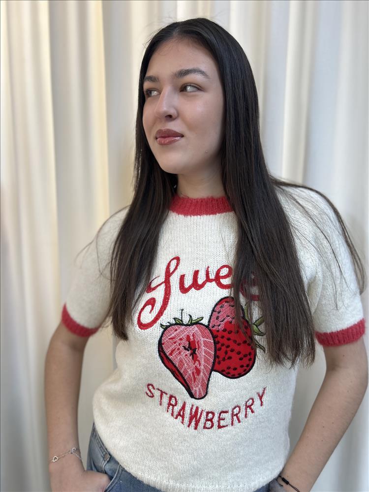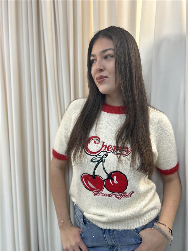 Tento dámsky pletený top s krátkym rukávom je výrazným a štýlovým kúskom, ktorý okamžite upúta pozornosť. Má krémový základ doplnený o červené kontrastné lemy na rukávoch a okolo výstrihu, ktoré mu dodávajú retro nádych. Dominantou je výrazná aplikácia čerešní a jahôd s nápisom na prednej strane, pôsobiaca hravo a žensky. Materiál je mäkký, príjemný na dotyk a mierne hrejivý, vďaka čomu je top ideálny na prechodné obdobie. Rovný, pohodlný strih krásne sedí na postave a ľahko sa kombinuje s rifľami, sukňou či šortkami.