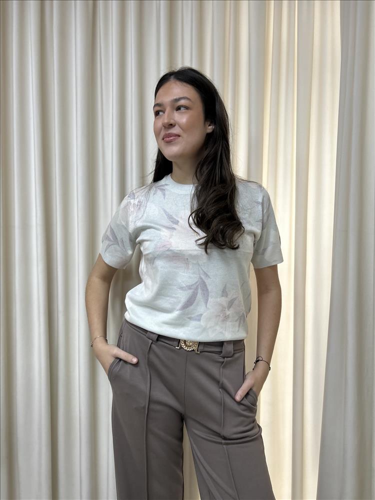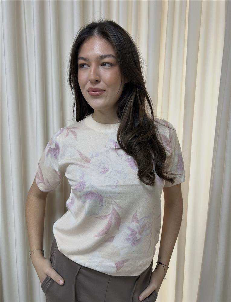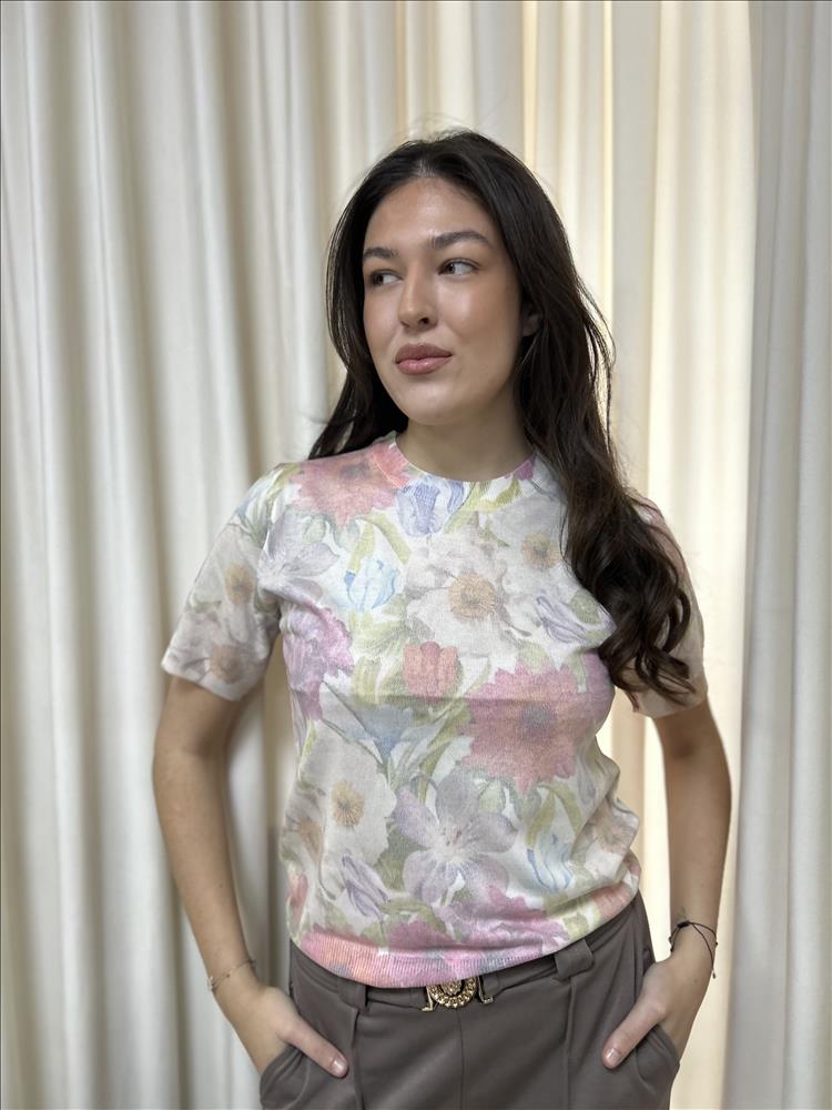 Tento dámsky top s kvetinovým vzorom je ideálnym kúskom pre svieži a elegantný vzhľad. Jemná kombinácia pastelových farieb vytvára romantický a nadčasový dizajn, ktorý sa ľahko kombinuje s nohavicami aj sukňou. Klasický okrúhly výstrih a krátky rukáv dodávajú topu univerzálnosť vhodnú na každodenné nosenie. Top je vyrobený z ľahkého a príjemného materiálu, ktorý sa pohodlne nosí a jemne sa prispôsobí postave. Spodný lem a výstrih sú zakončené kontrastným rebrovaným úpletom, ktorý dodáva modelu upravený a kvalitný vzhľad. Skvelo sa hodí do práce, na stretnutia aj voľný čas.