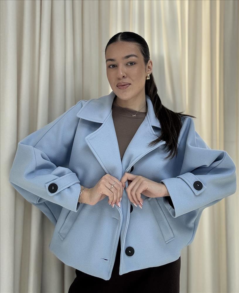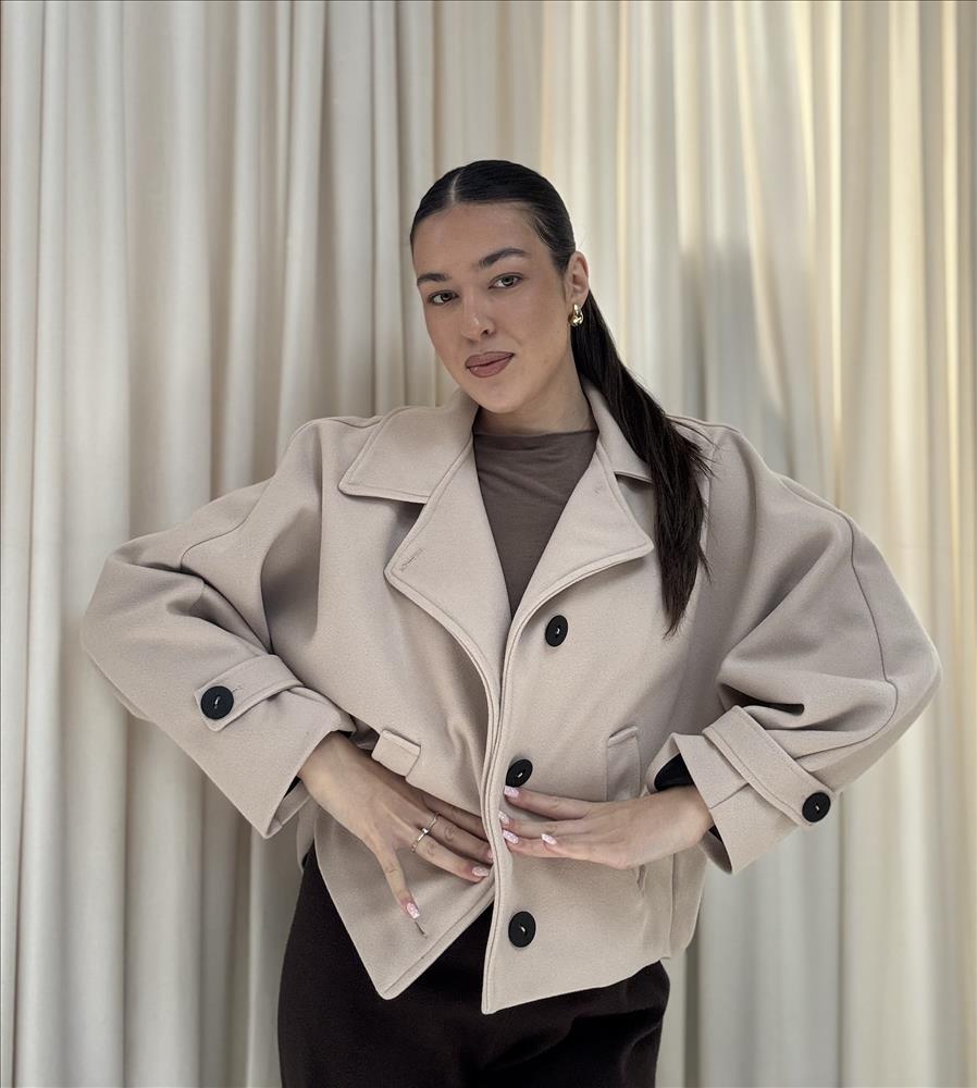 Elegantný krátky kabát je ideálnou voľbou pre prechodné obdobie aj chladnejšie dni. Má moderný, mierne oversized strih so spadnutými ramenami, ktorý pôsobí štýlovo a zároveň pohodlne. Výrazný golier dodáva kabátu sofistikovaný vzhľad a veľké kontrastné gombíky vytvárajú zaujímavý detail. Kabát je doplnený praktickými prednými vreckami a ozdobnými manžetami s gombíkmi. Vďaka kratšej dĺžke sa skvelo kombinuje s nohavicami s vysokým pásom, sukňou aj šatami. Mäkký a príjemný materiál zabezpečuje komfort pri nosení počas celého dňa. Perfektný kúsok do elegantných aj casual outfitov, ktorý oživí každý šatník.