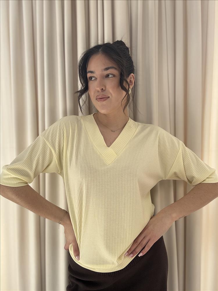 Dámske rebrované tričko v jemnom maslovo-žltom odtieni je ideálnym kúskom pre každodenný štýlový outfit. Minimalistický dizajn dopĺňa moderný V-výstrih, ktorý krásne zvýrazní dekolt a dodá modelu ženský nádych. Tričko je vyrobené z príjemného, mäkkého a pružného materiálu s jemnou rebrovanou štruktúrou, ktorá sa prispôsobí postave a zabezpečí pohodlie počas celého dňa. Voľnejší strih s kratším rukávom pôsobí ležérne, no zároveň elegantne, takže sa ľahko kombinuje s nohavicami, sukňou aj šortkami.
