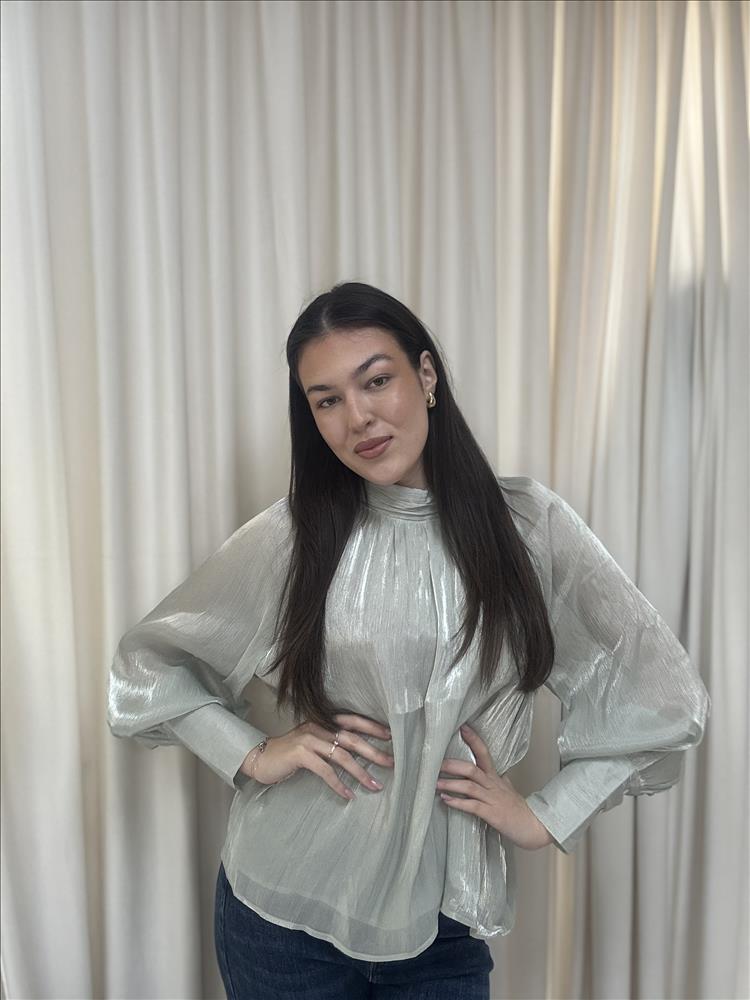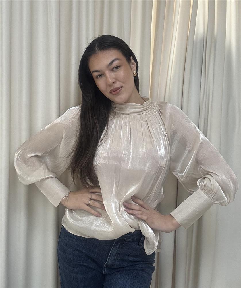 Elegantná dámska blúzka, ktorá zaujme svojím luxusným lesklým materiálom a sofistikovaným dizajnom. Blúzka má jemne riasený vysoký golier, ktorý dodáva modelu ženskosť a elegantný charakter. Voľnejší strih spolu s ľahkým splývavým materiálom zabezpečuje pohodlie počas celého dňa a krásne sa prispôsobí postave. Dlhé rukávy sú zakončené manžetami, ktoré podčiarkujú elegantný vzhľad. Blúzka je ideálnou voľbou na formálne príležitosti, do práce, ale aj na večerné stretnutia. Skvele sa kombinuje s nohavicami, sukňou alebo rifľami pre štýlový moderný outfit.
