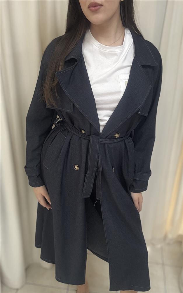 Elegantný dámsky trenčkot v tmavomodrom odtieni, ktorý je nadčasovým kúskom vhodným na každodenné nosenie aj elegantnejšie príležitosti. Kabát zaujme klasickým strihom s výrazným golierom a dvojradovým zapínaním na gombíky, ktoré dodáva modelu sofistikovaný vzhľad. Súčasťou kabáta je opasok v páse, vďaka ktorému si môžete prispôsobiť siluetu a zvýrazniť postavu. Kvalitný materiál je príjemný na nosenie a ideálny na prechodné obdobie. Trenčkot sa ľahko kombinuje s elegantnými outfitmi, ale aj s ležérnym štýlom – napríklad s rifľami a tričkom.